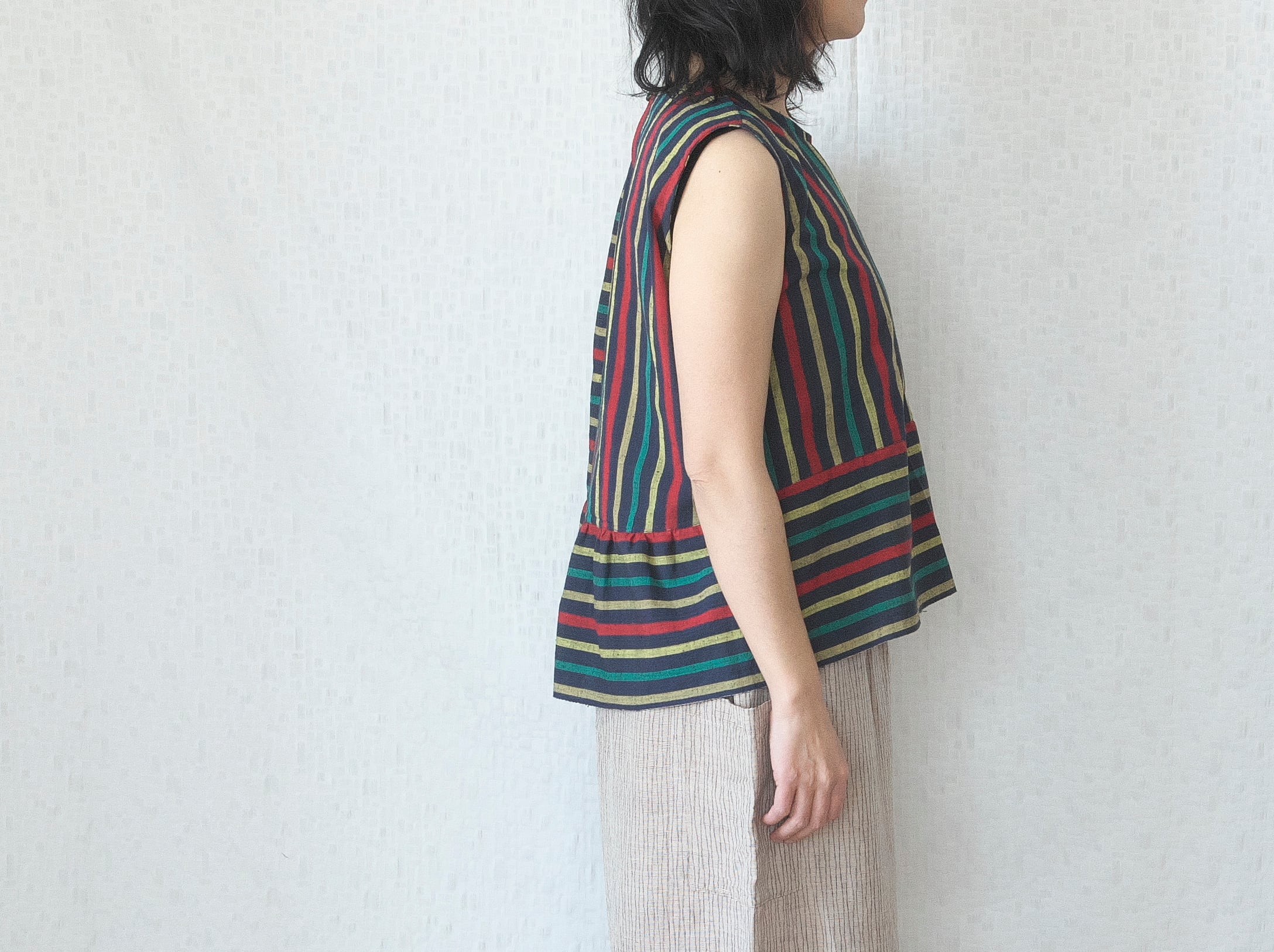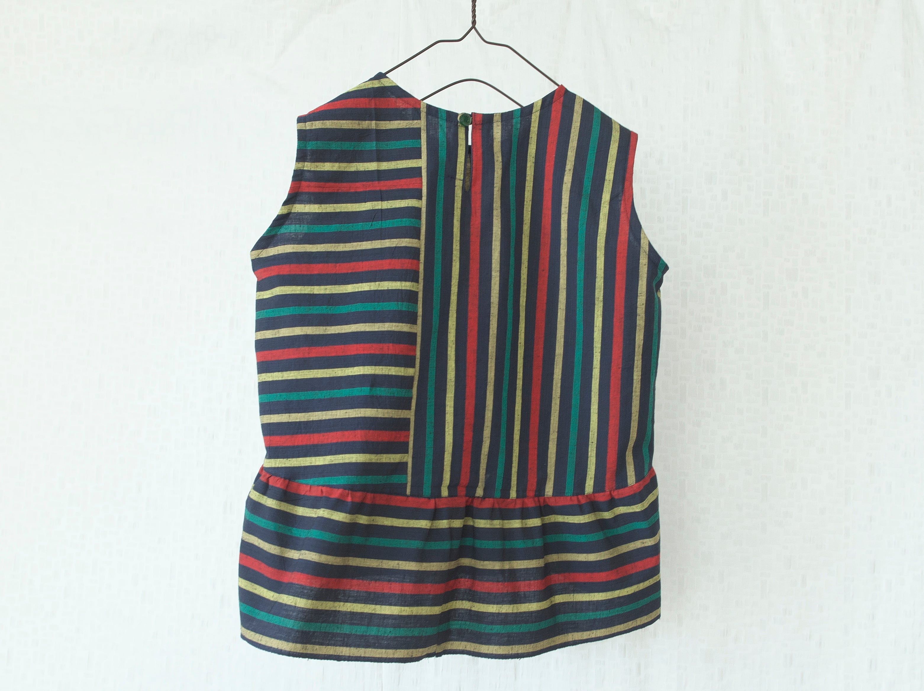 生地を縦横に組み合わせ、個性的なプルオーバーに仕上げました。