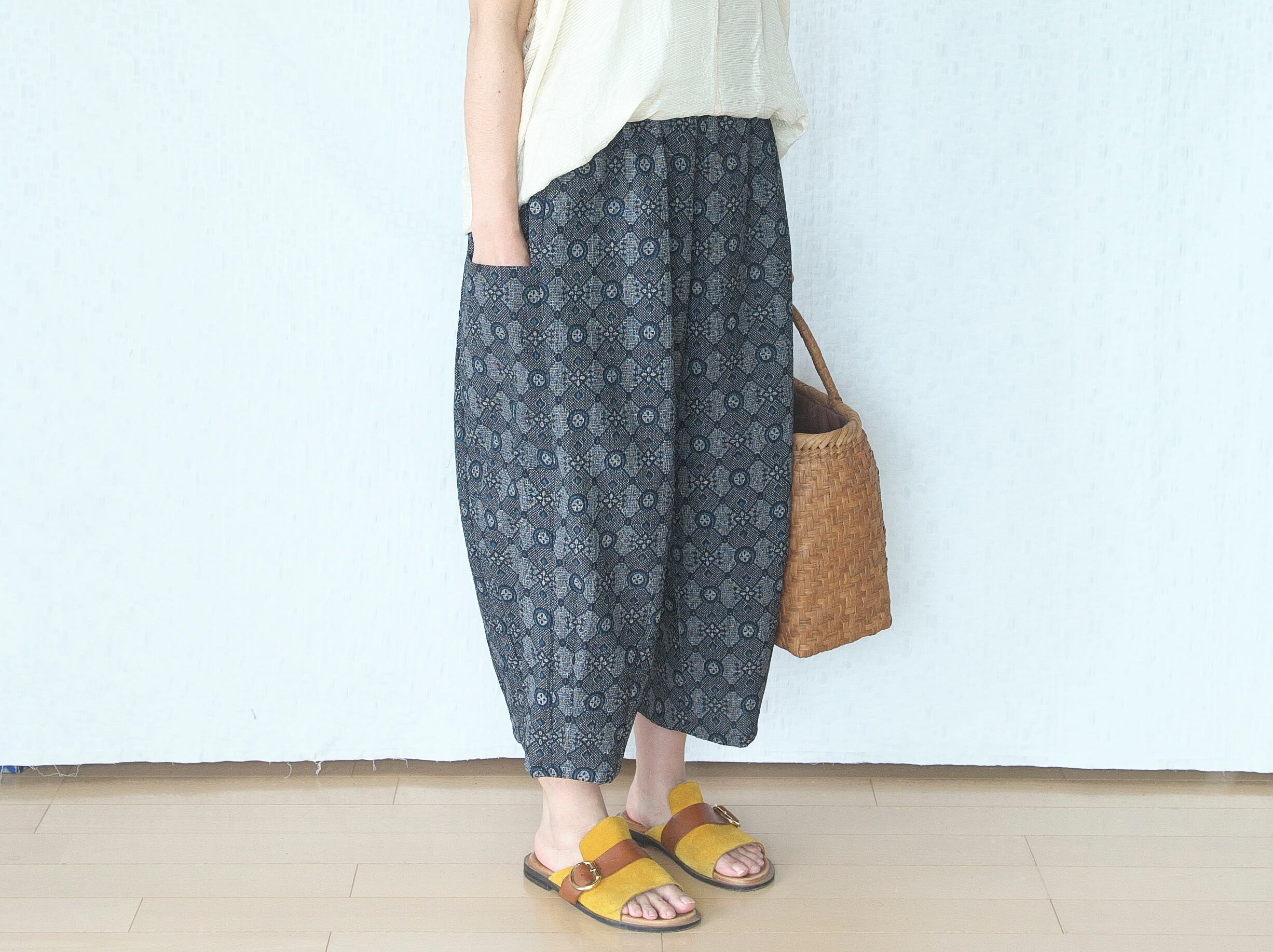縮みのお着物をリメイクしたパンツです。
