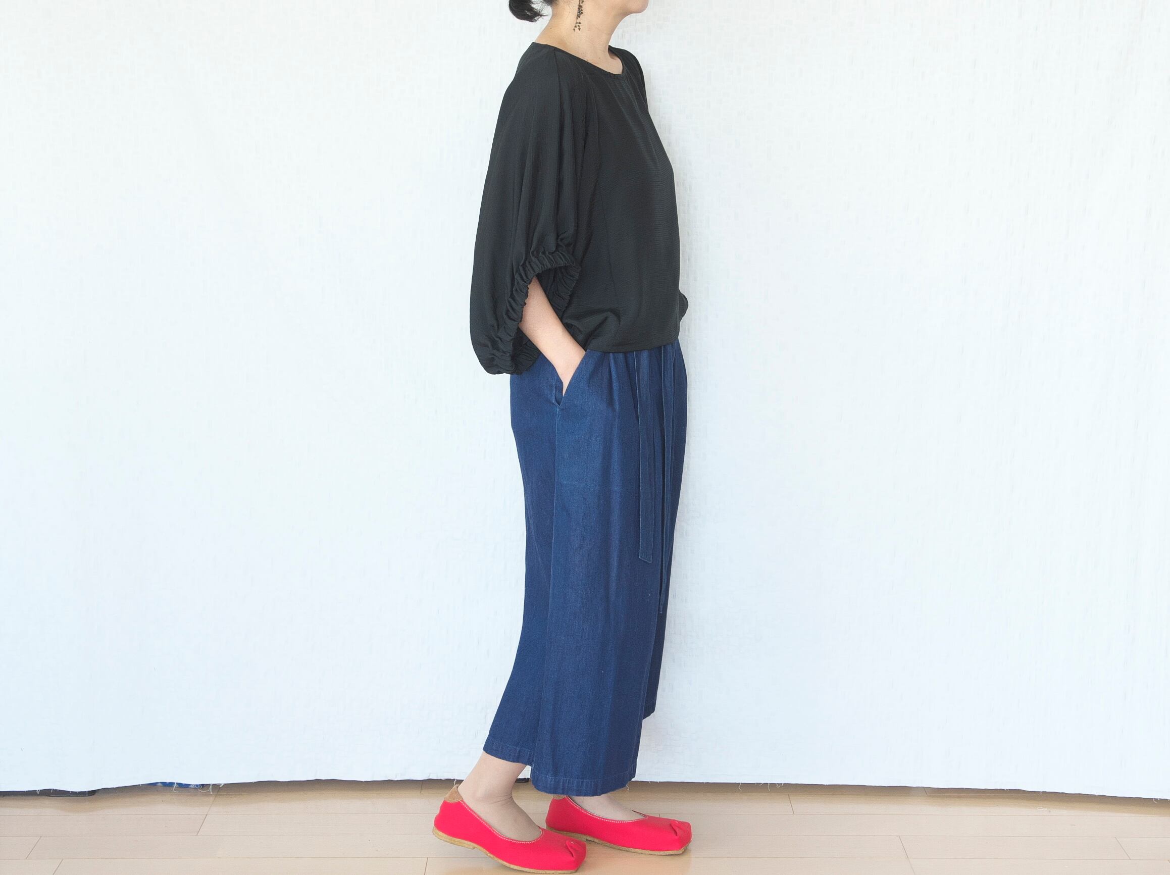 広がらないように収めた裾は、ショート丈なのでインしなくてもスッキリまとまります。