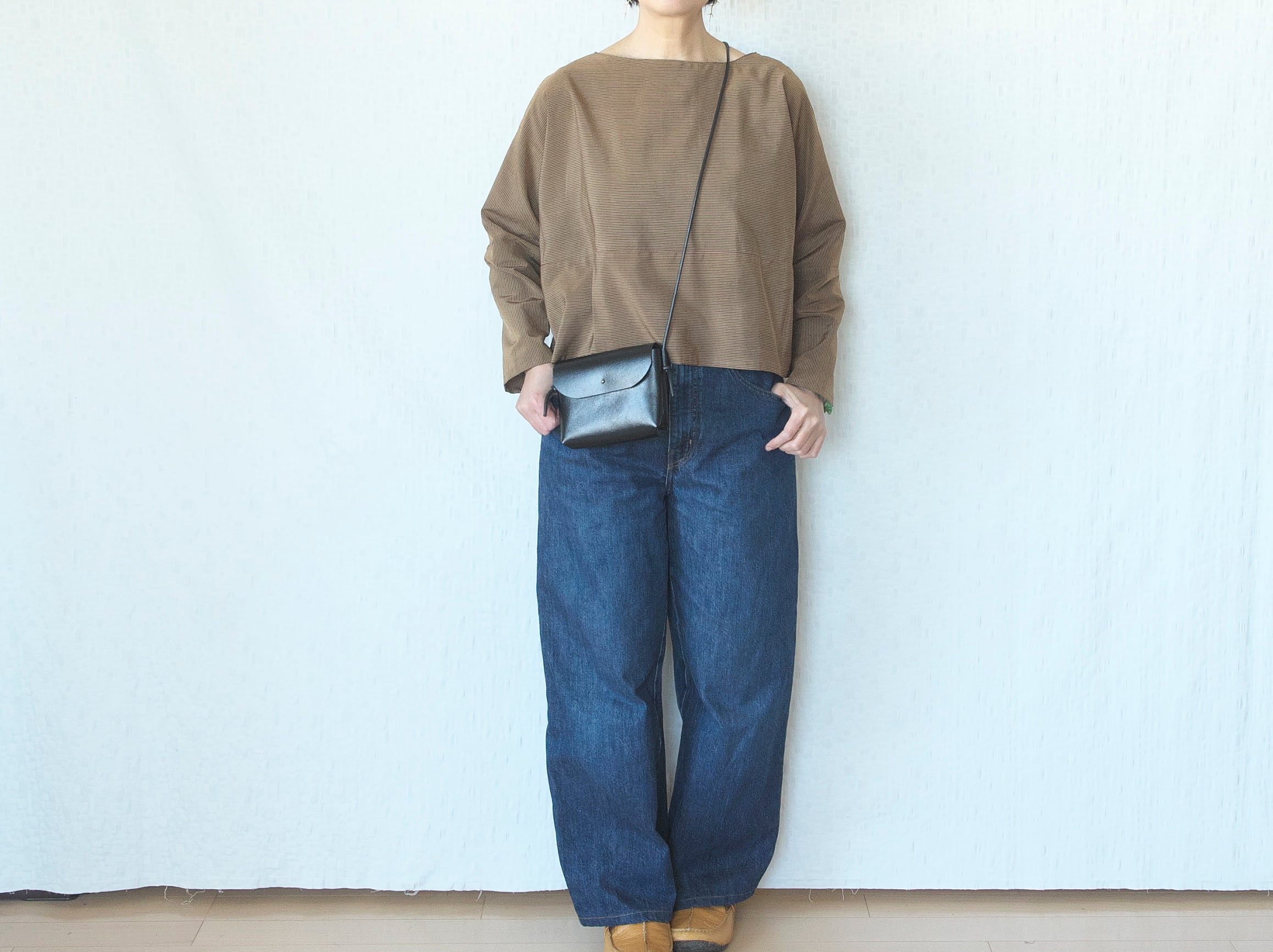 ボートネックの襟ぐりはデコルテをすっきり見せてくれます。