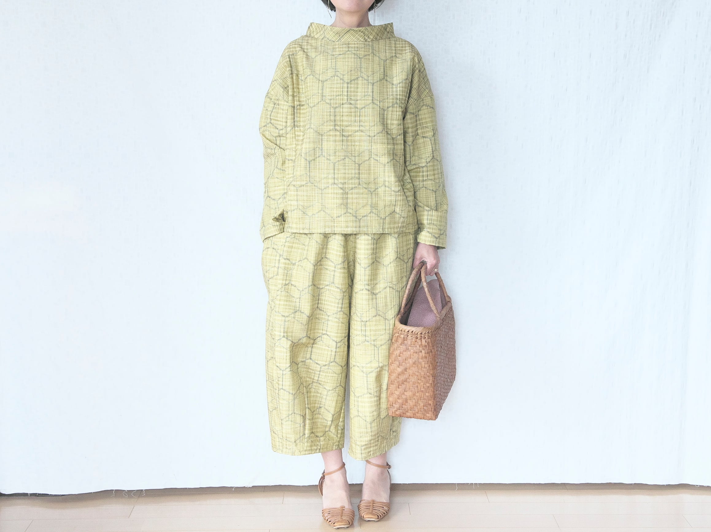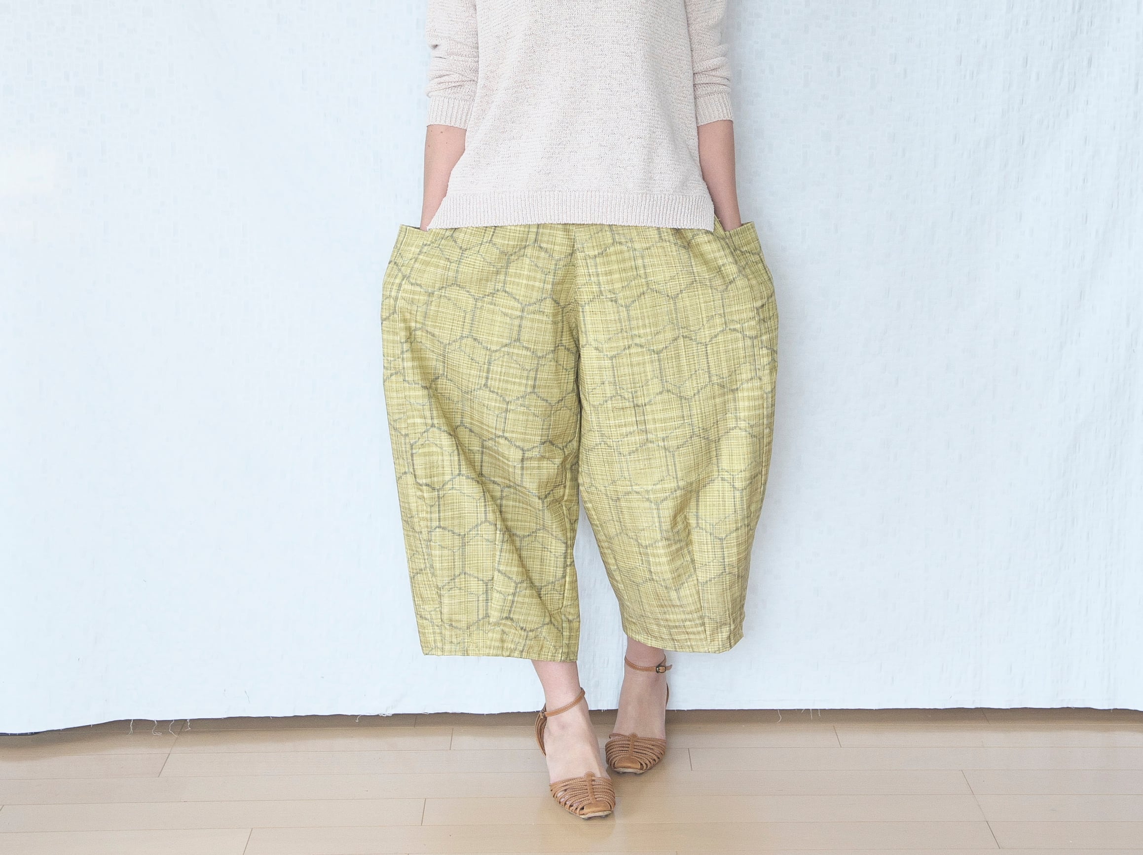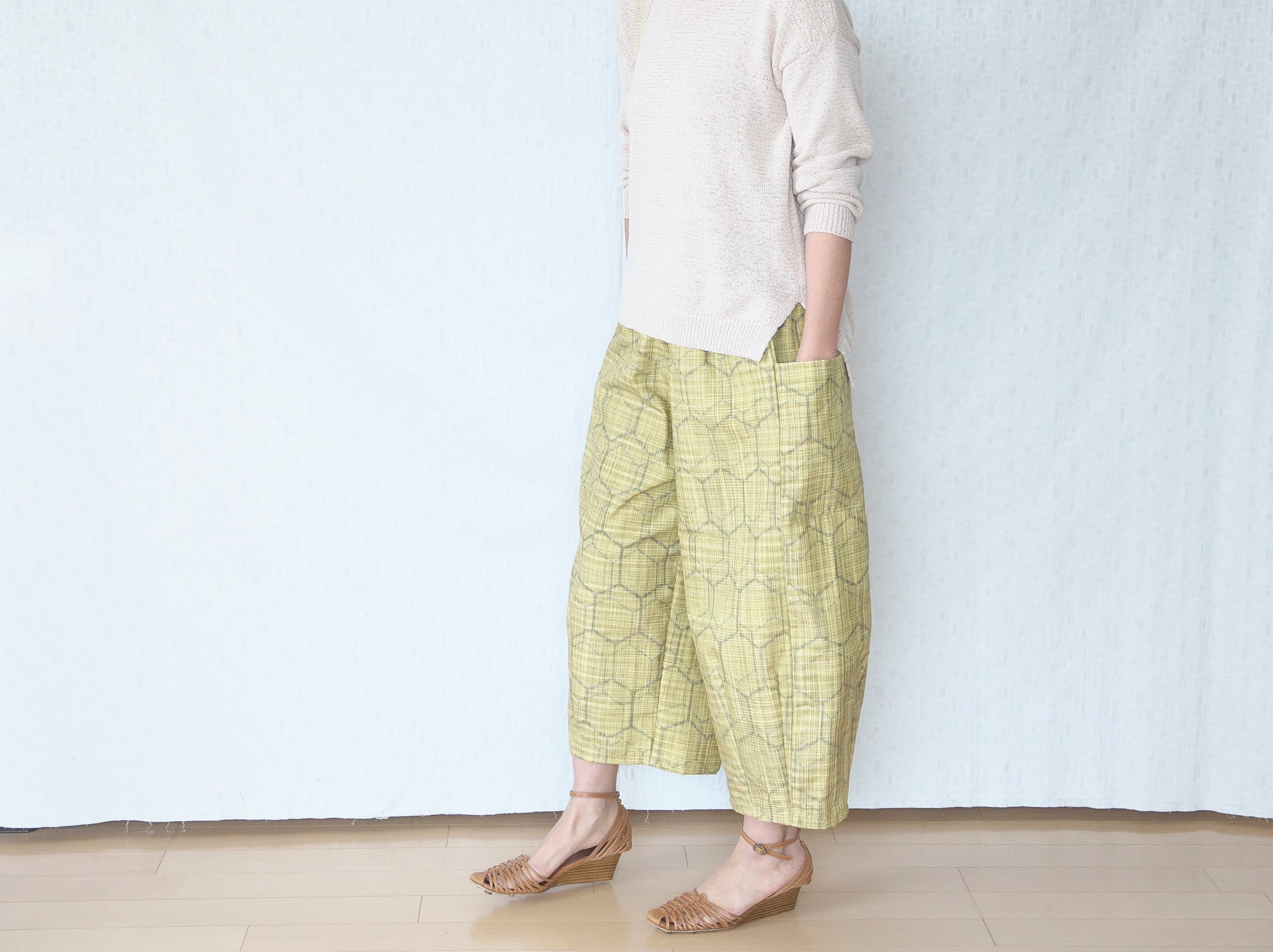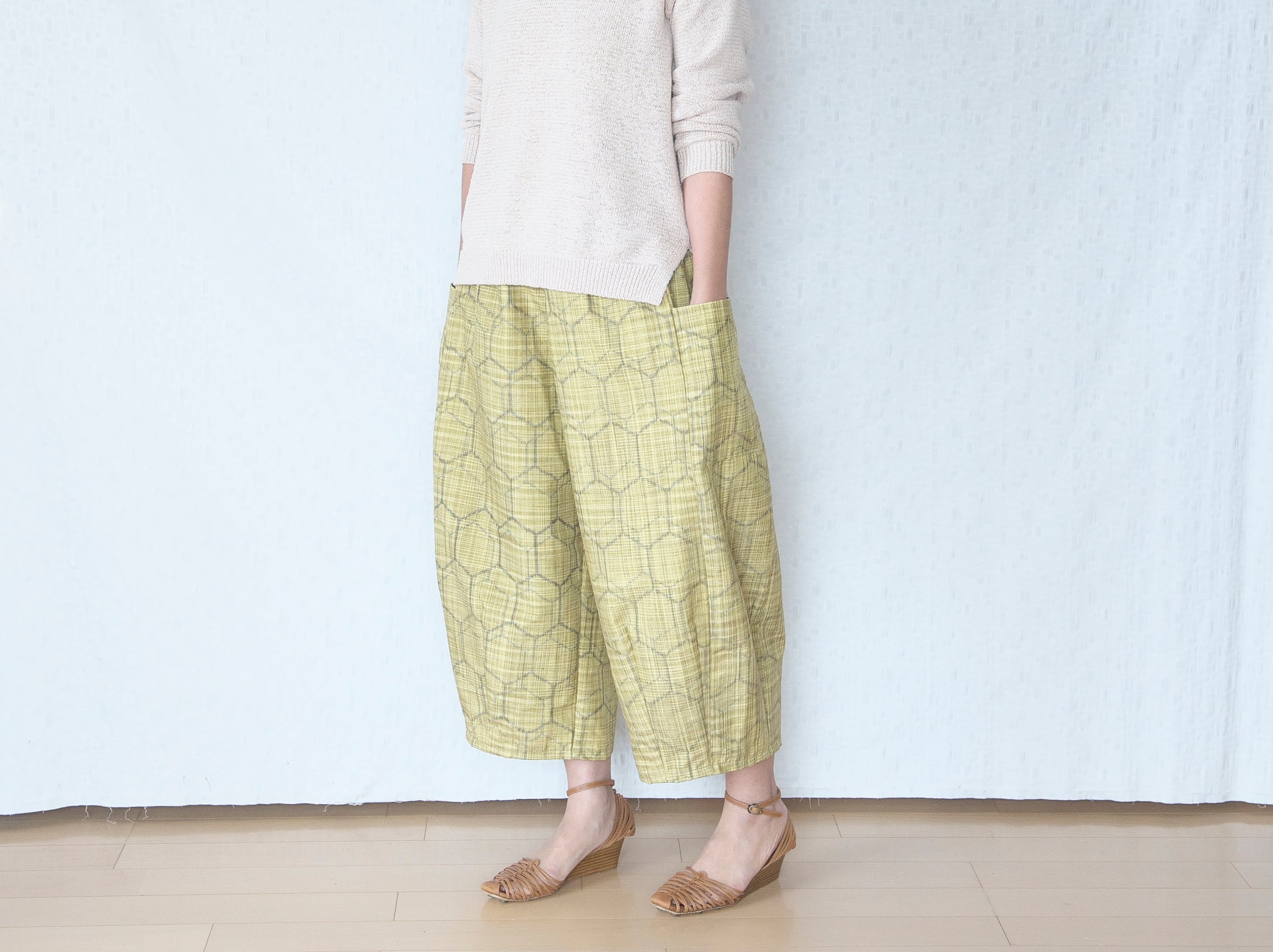 ざっくり素朴な紬の温もり、明るく爽やかな黄色の春らしいパンツができました。