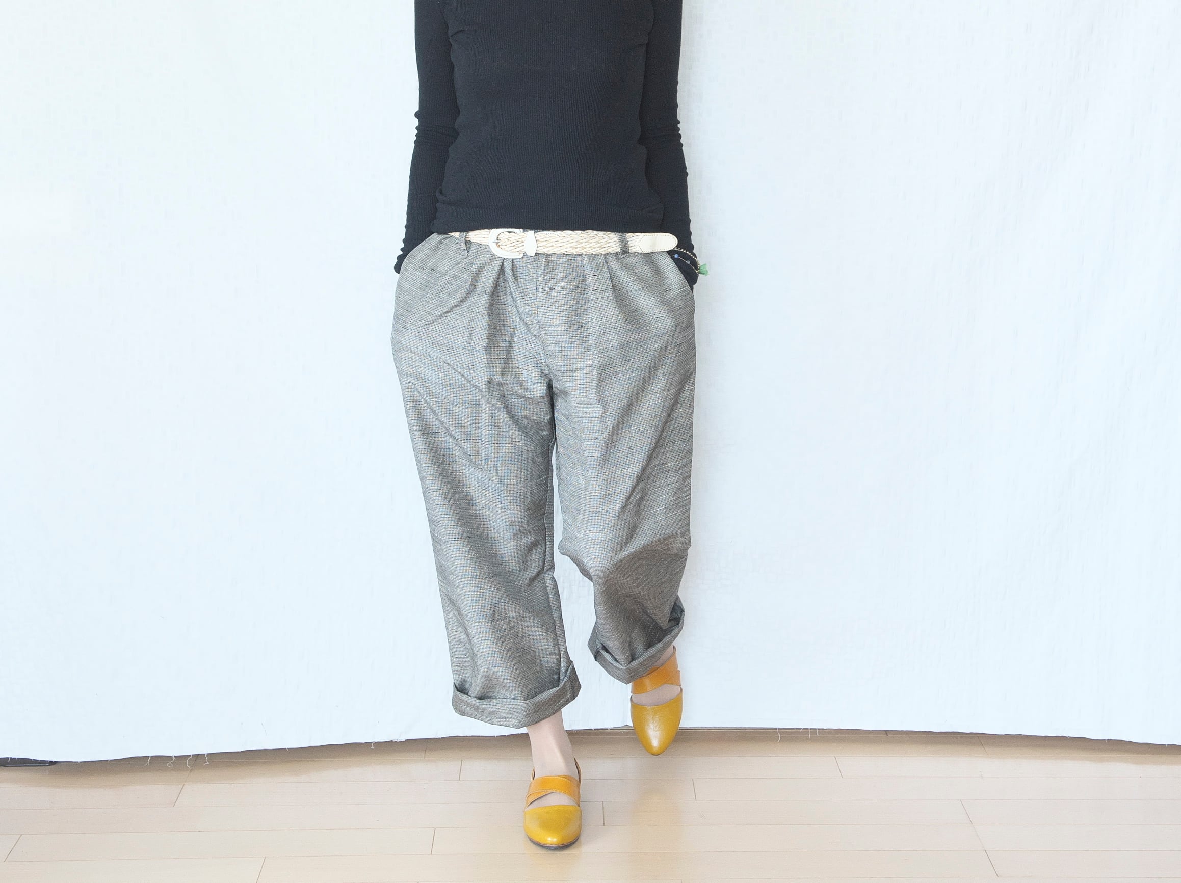 ロールアップが苦手な方は裾上げもできますので、ご注文時に総丈(ウエストから裾までの長さ)をお伝えください。
