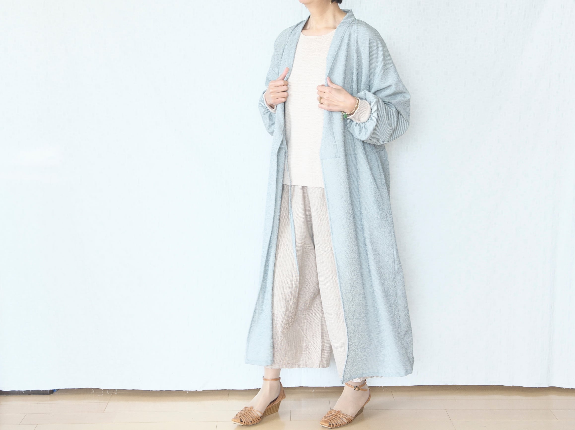 前をあけてジレのように羽織るのも素敵。