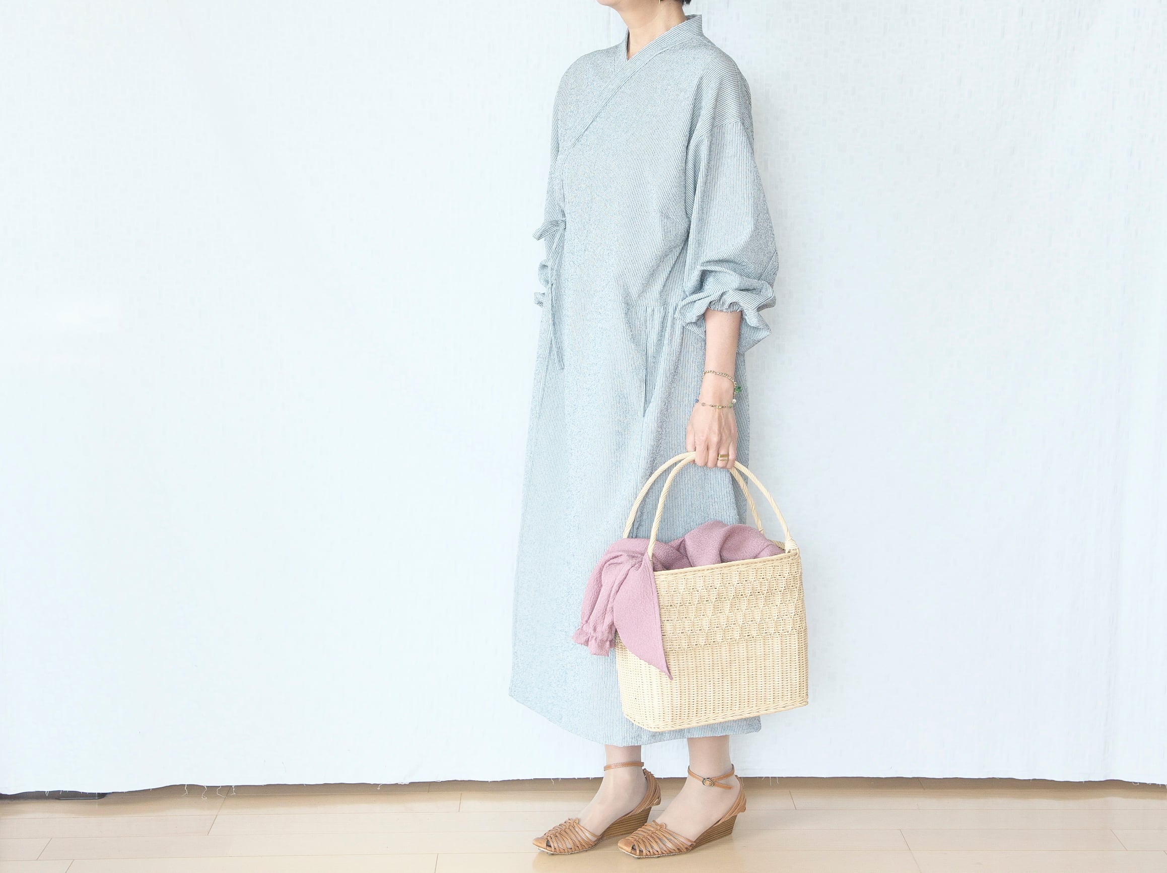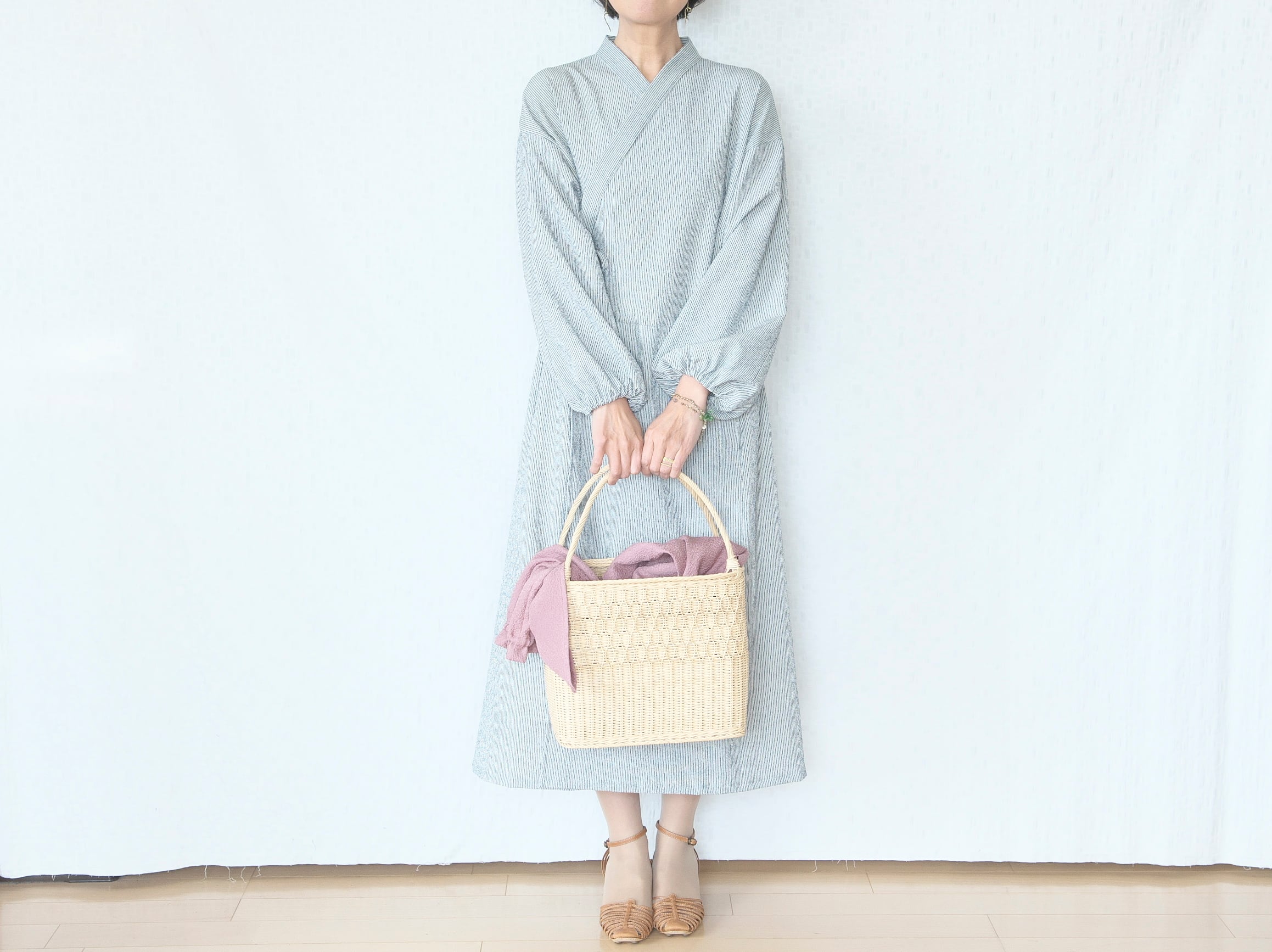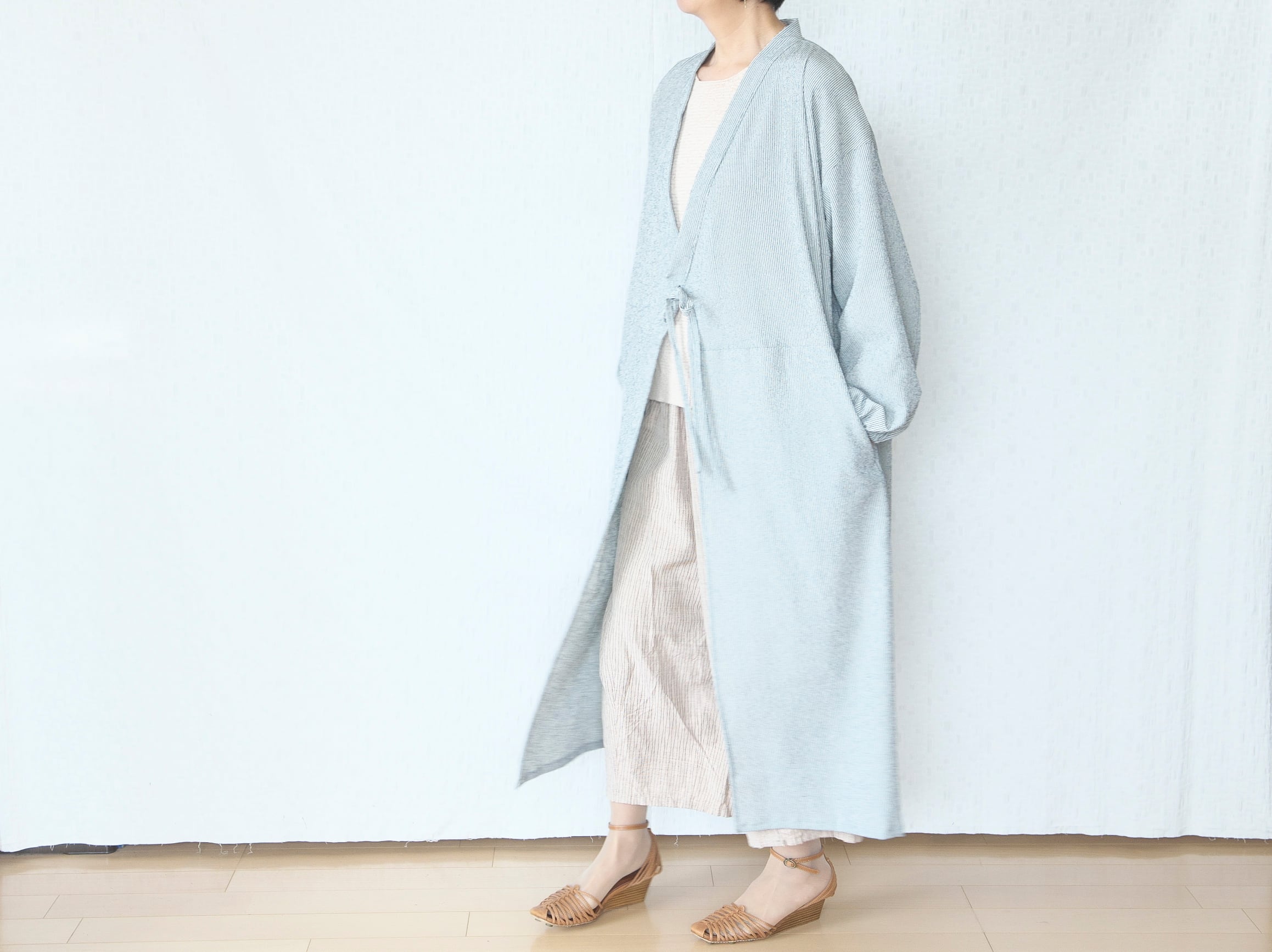 交差させず前で結べばゆったりラインのオーバーワンピ。
