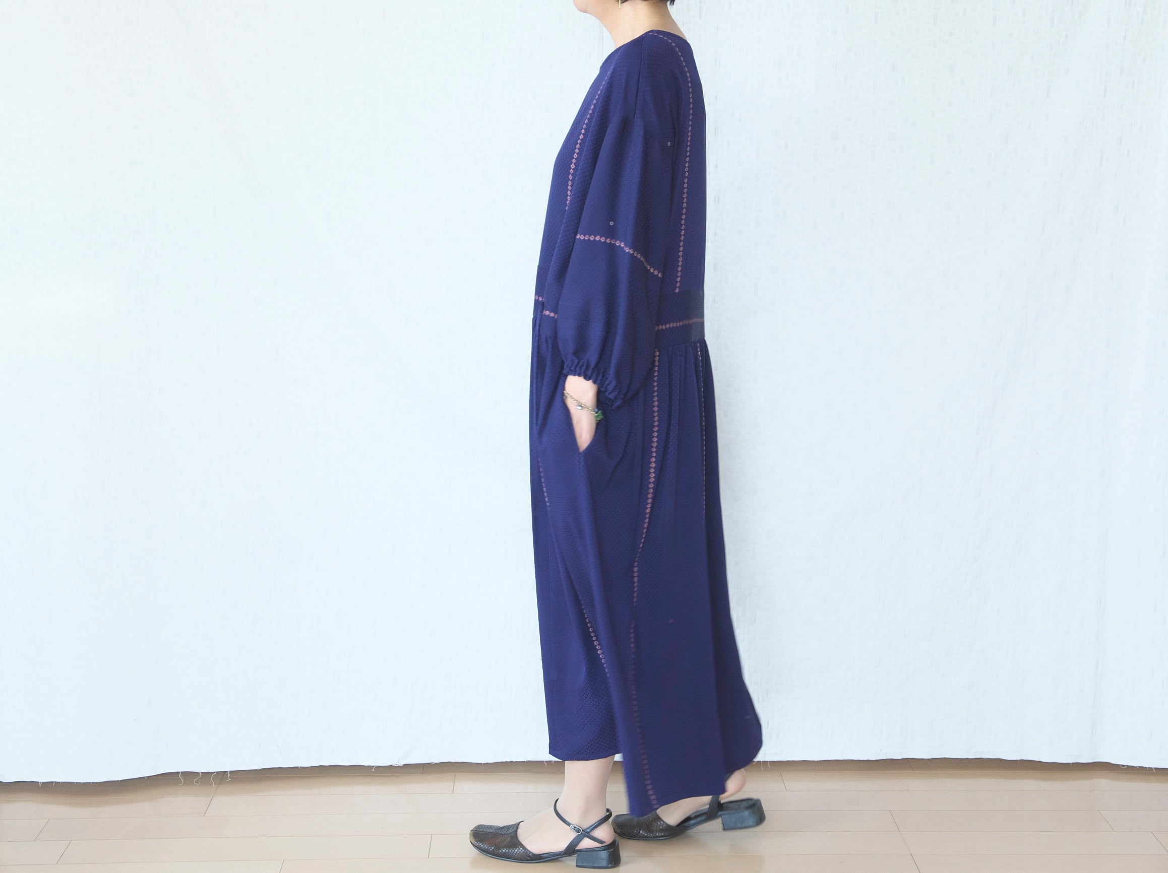 ウエストをベルトに見立てて切り替えたゆったりワンピース。
