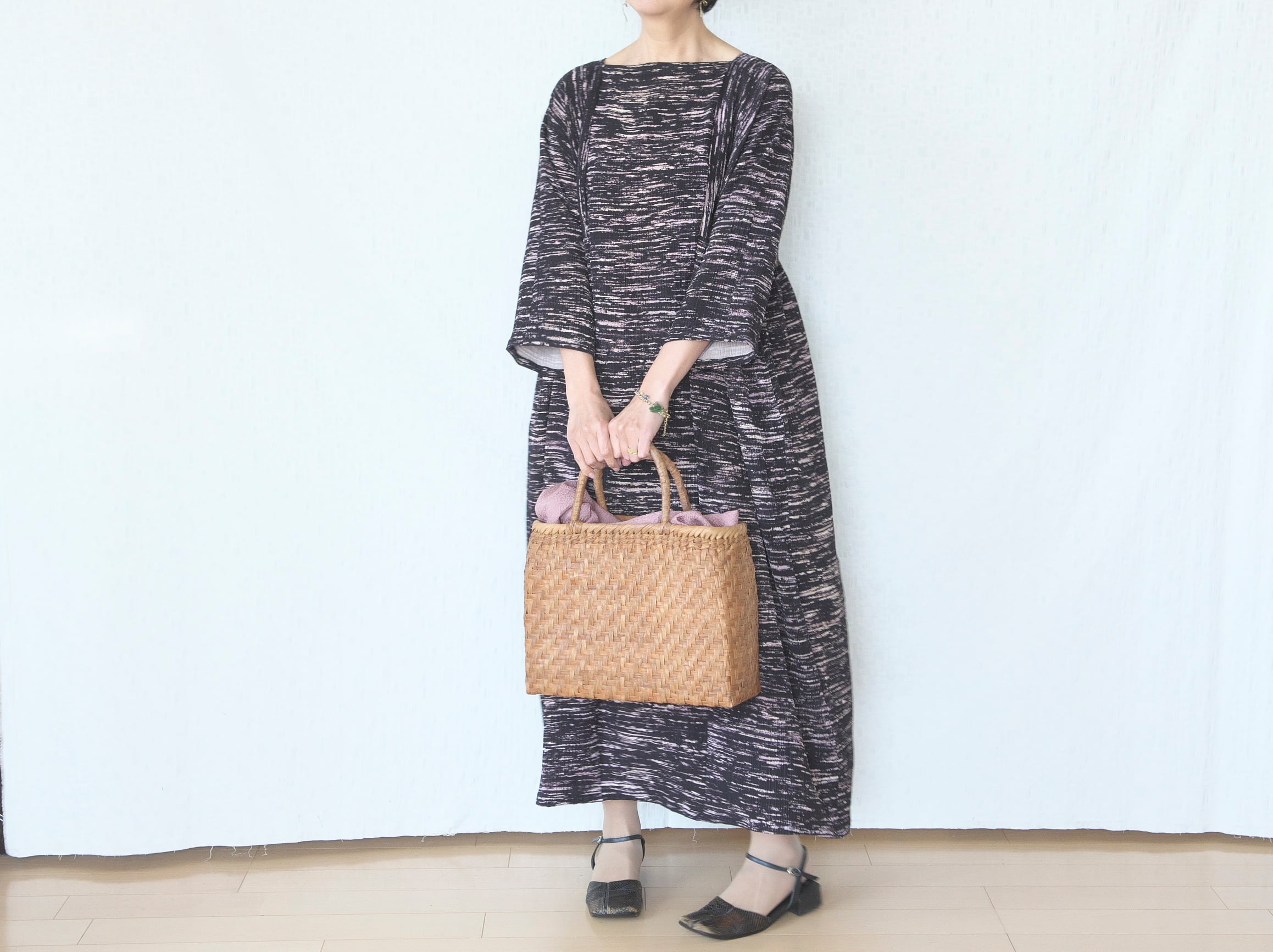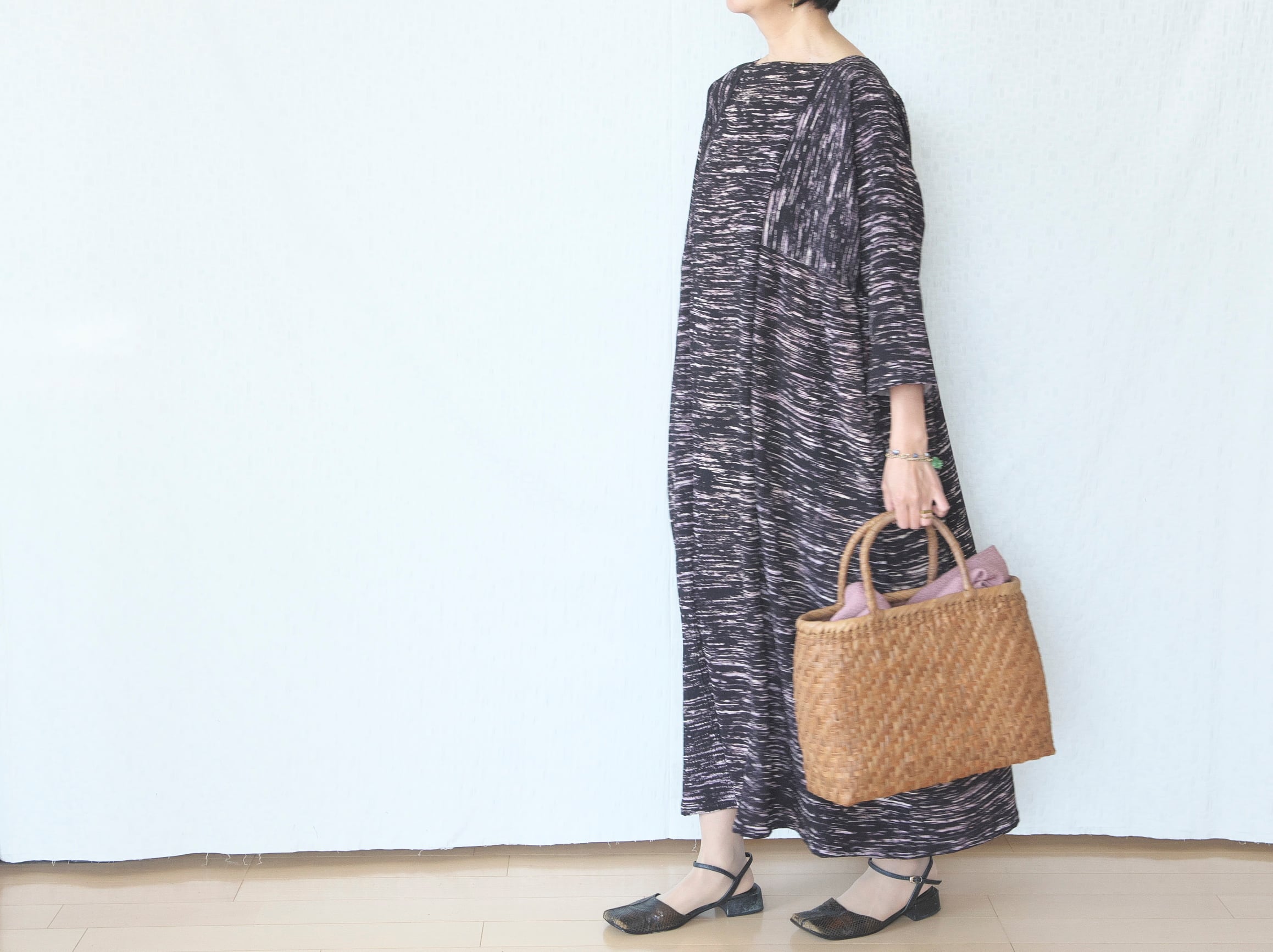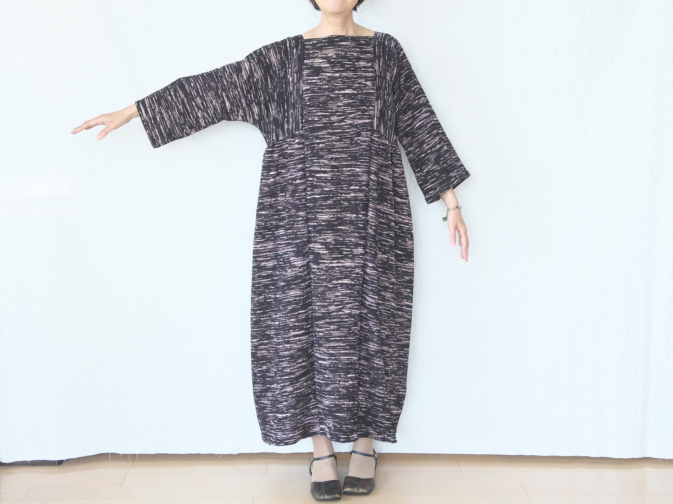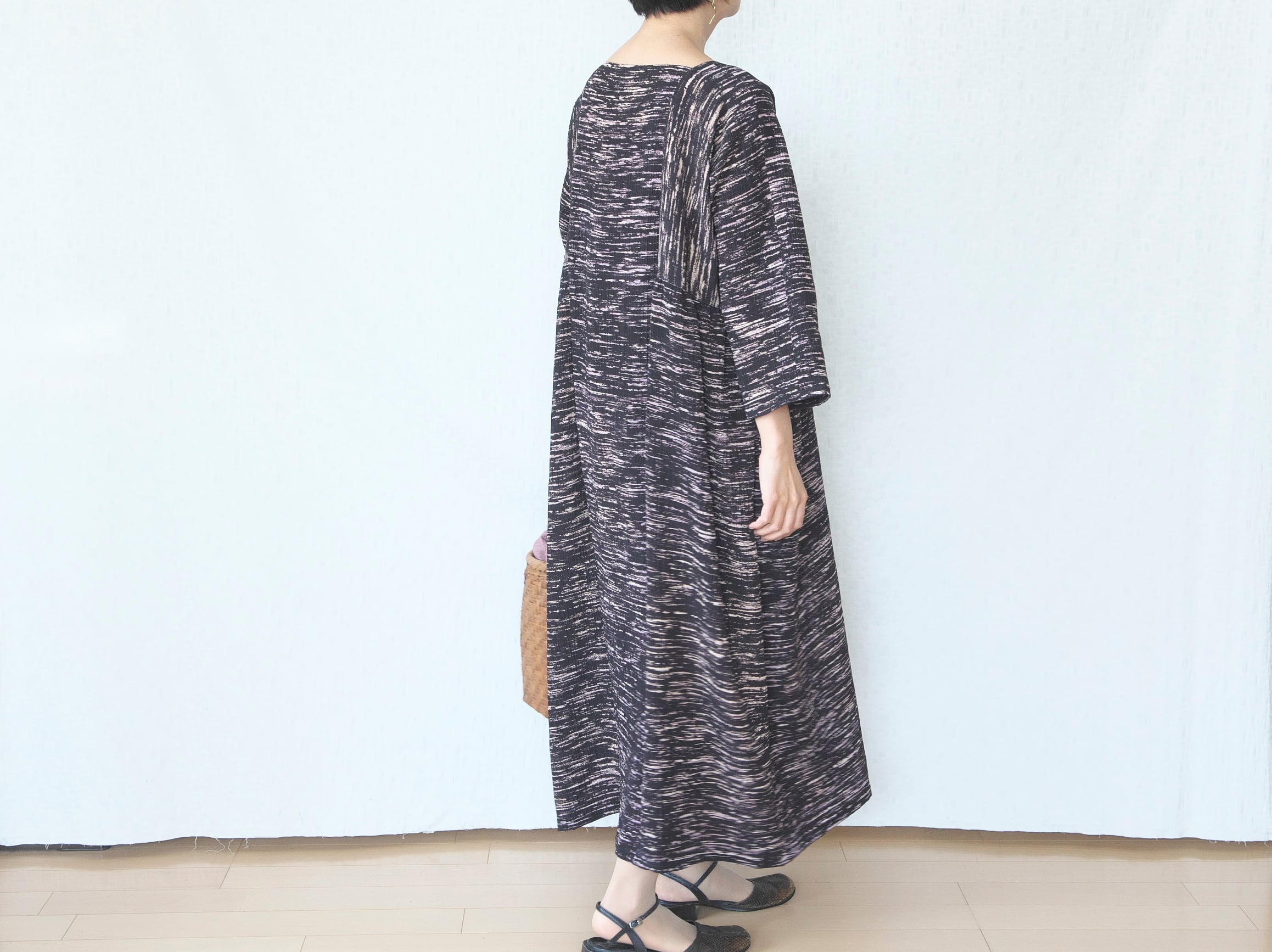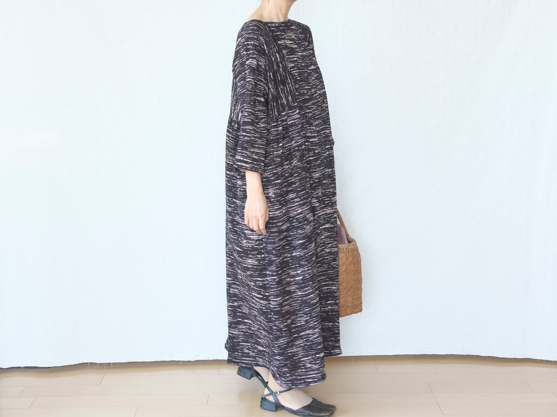 独特の味わいのある生地をたっぷり使って、マキシ丈のボリュームワンピースを作りました。