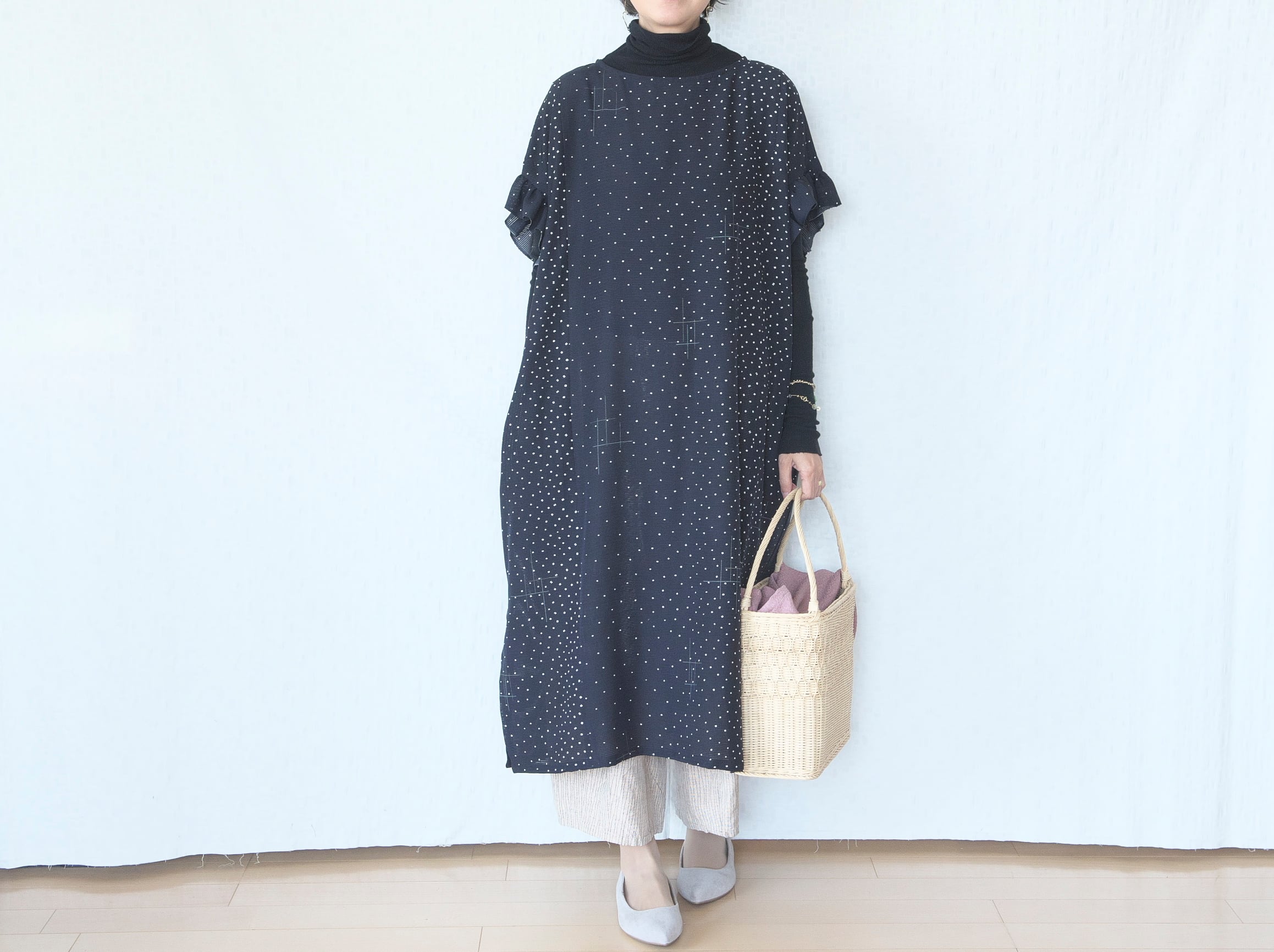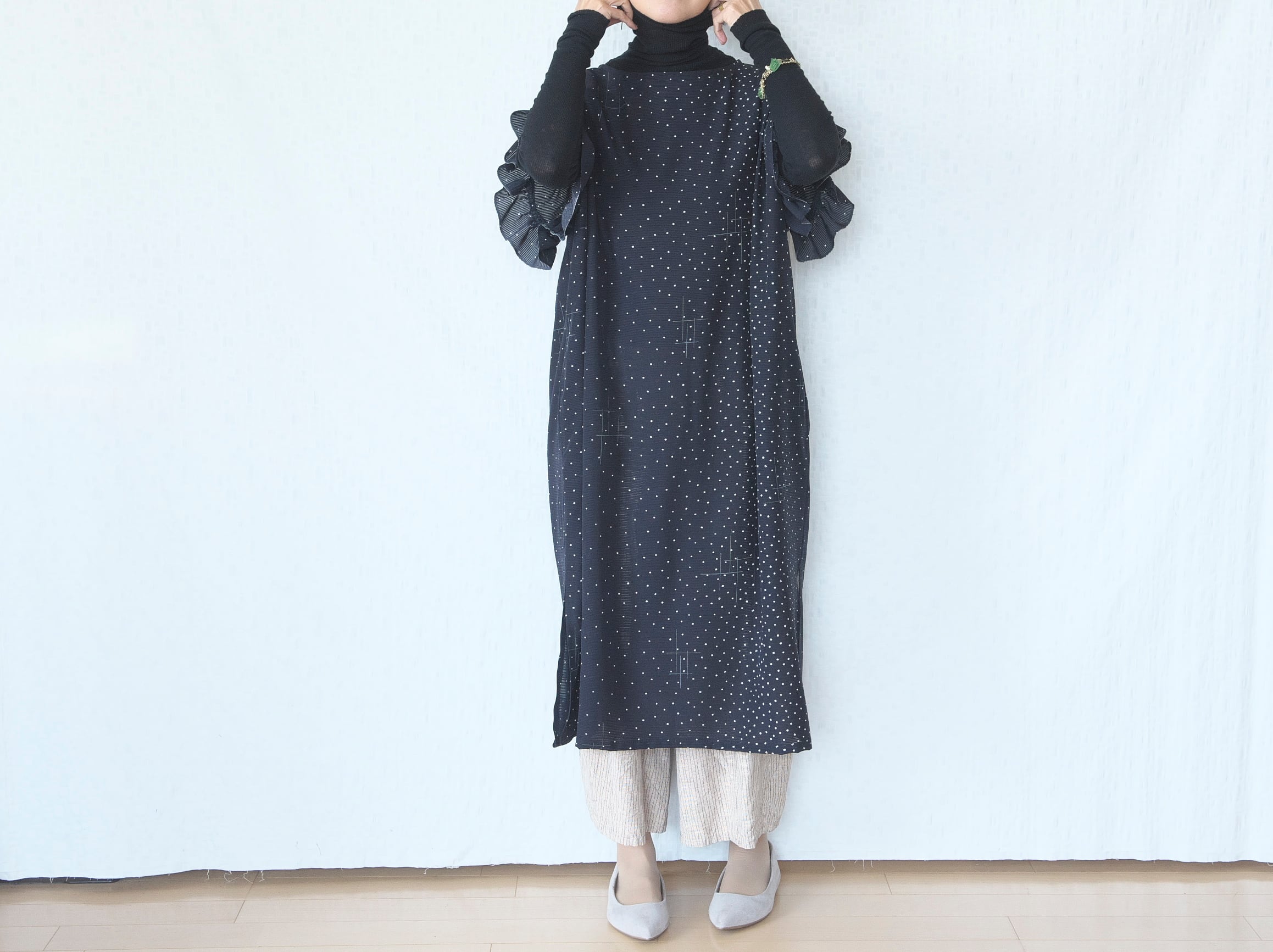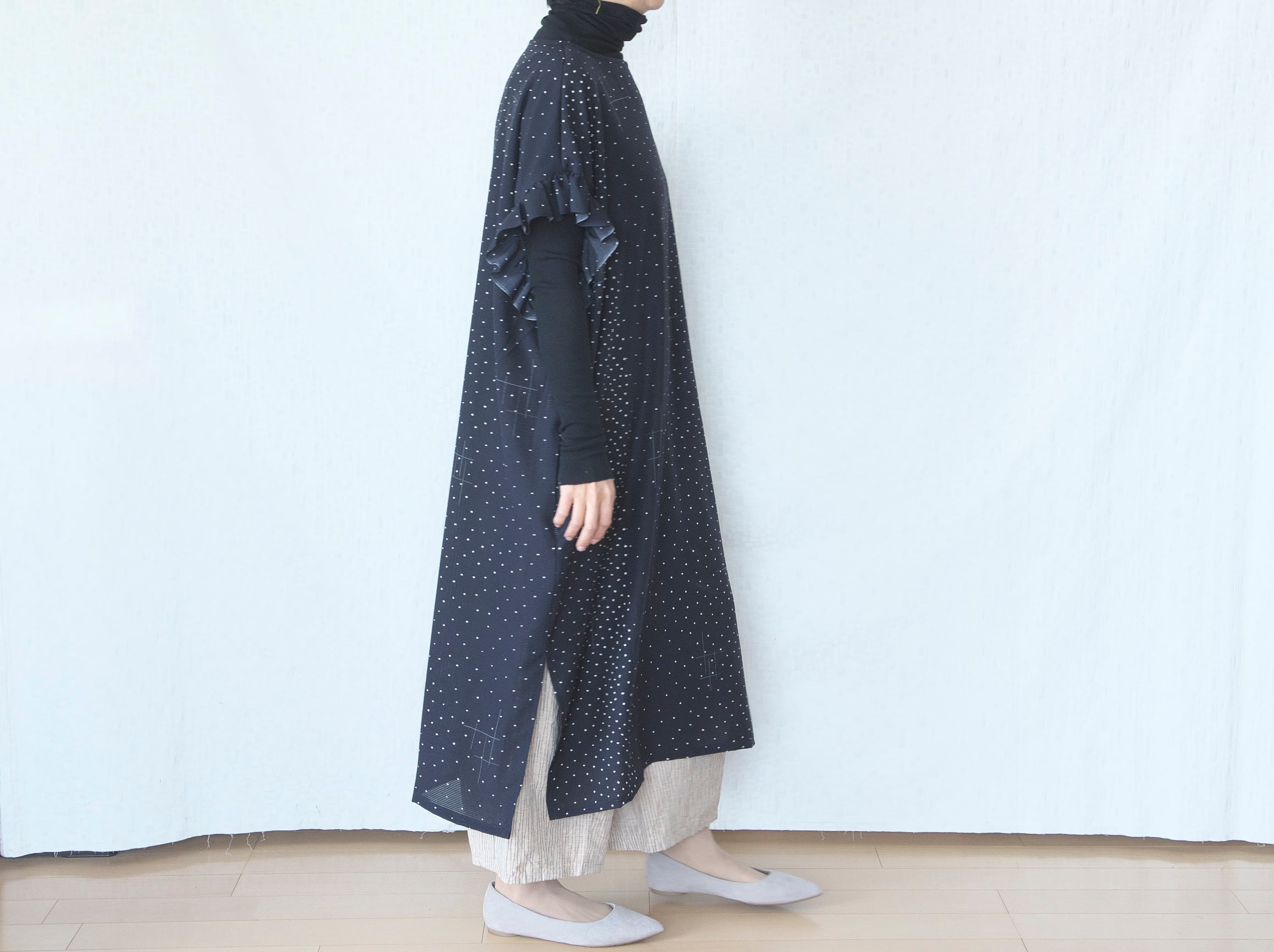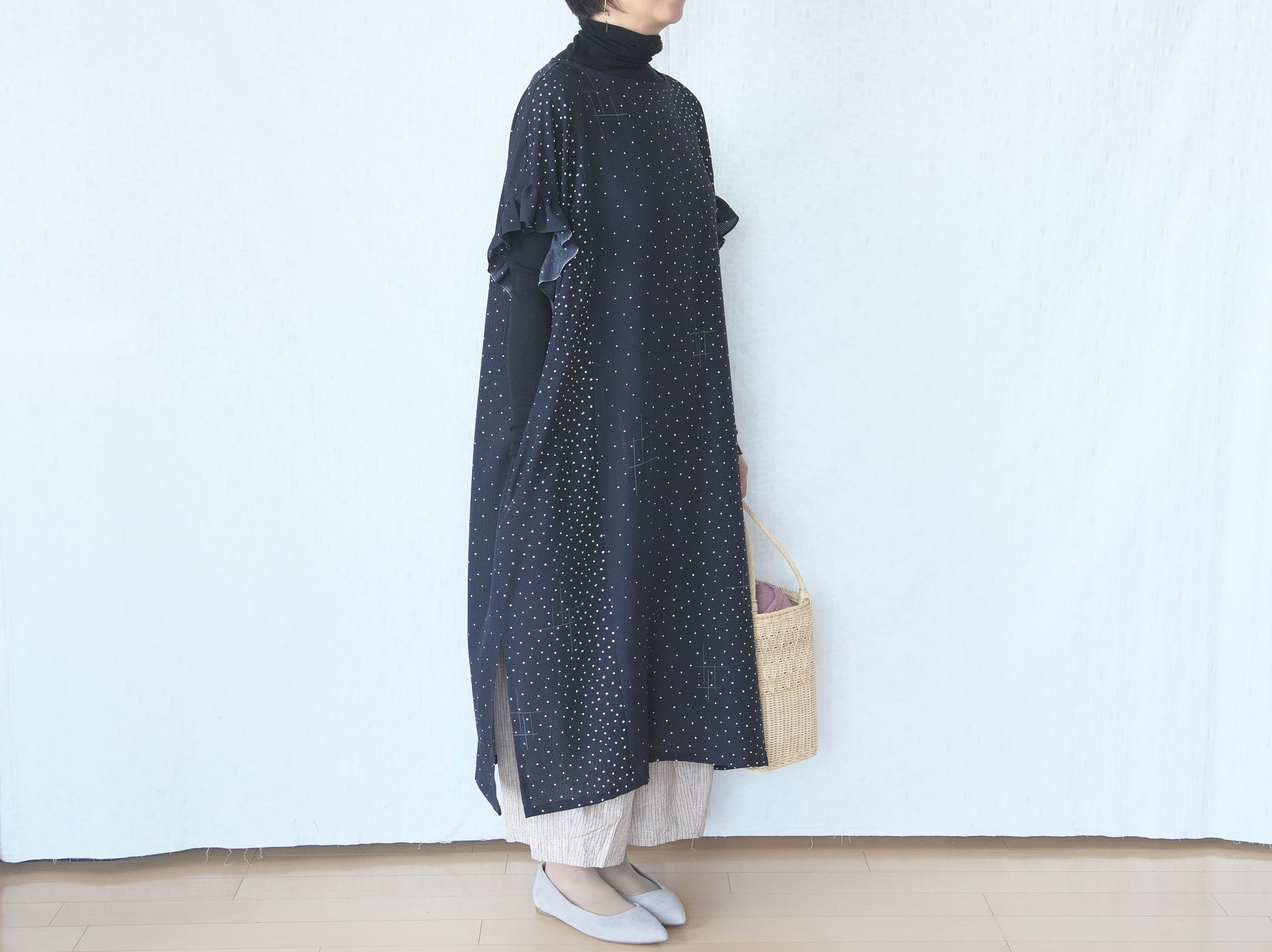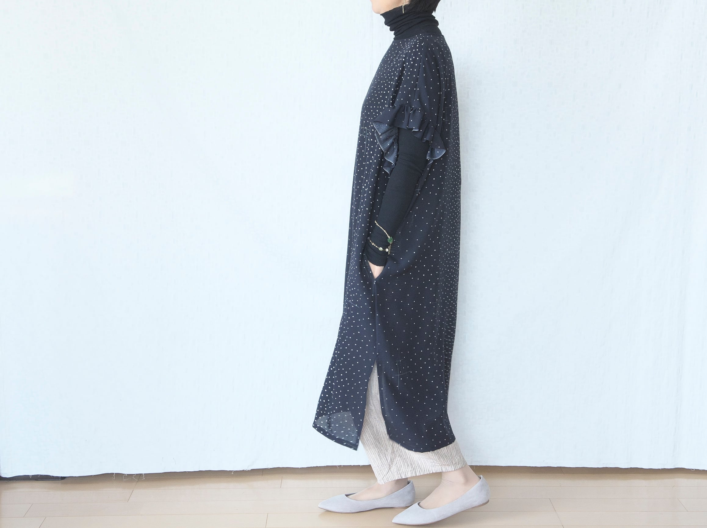 両サイドにスリットが入っていて、パンツやレギンスと合わせるとと甘くなりすぎず大人っぽく着ていただけます。