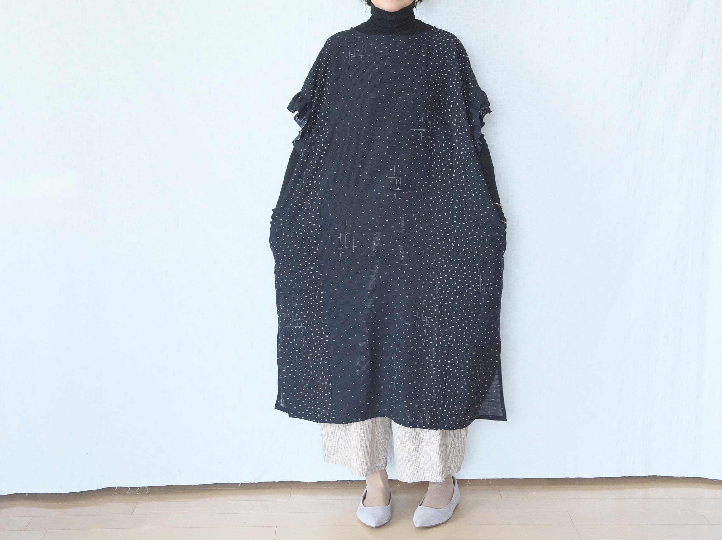 ゆったりサイズですが、落ち感のある生地なので、体のラインに自然に沿います。