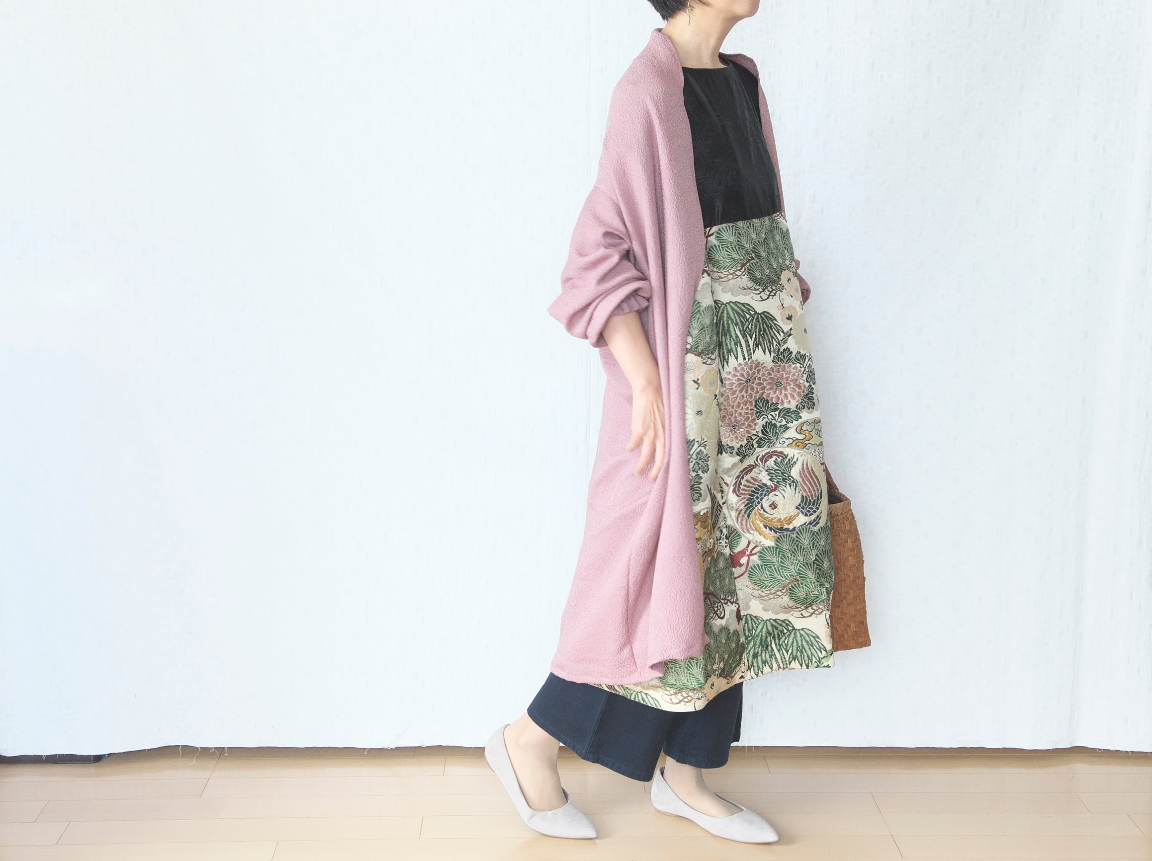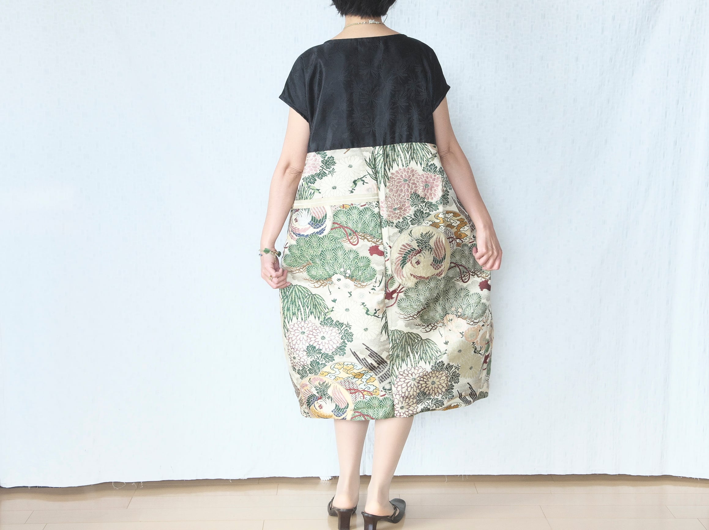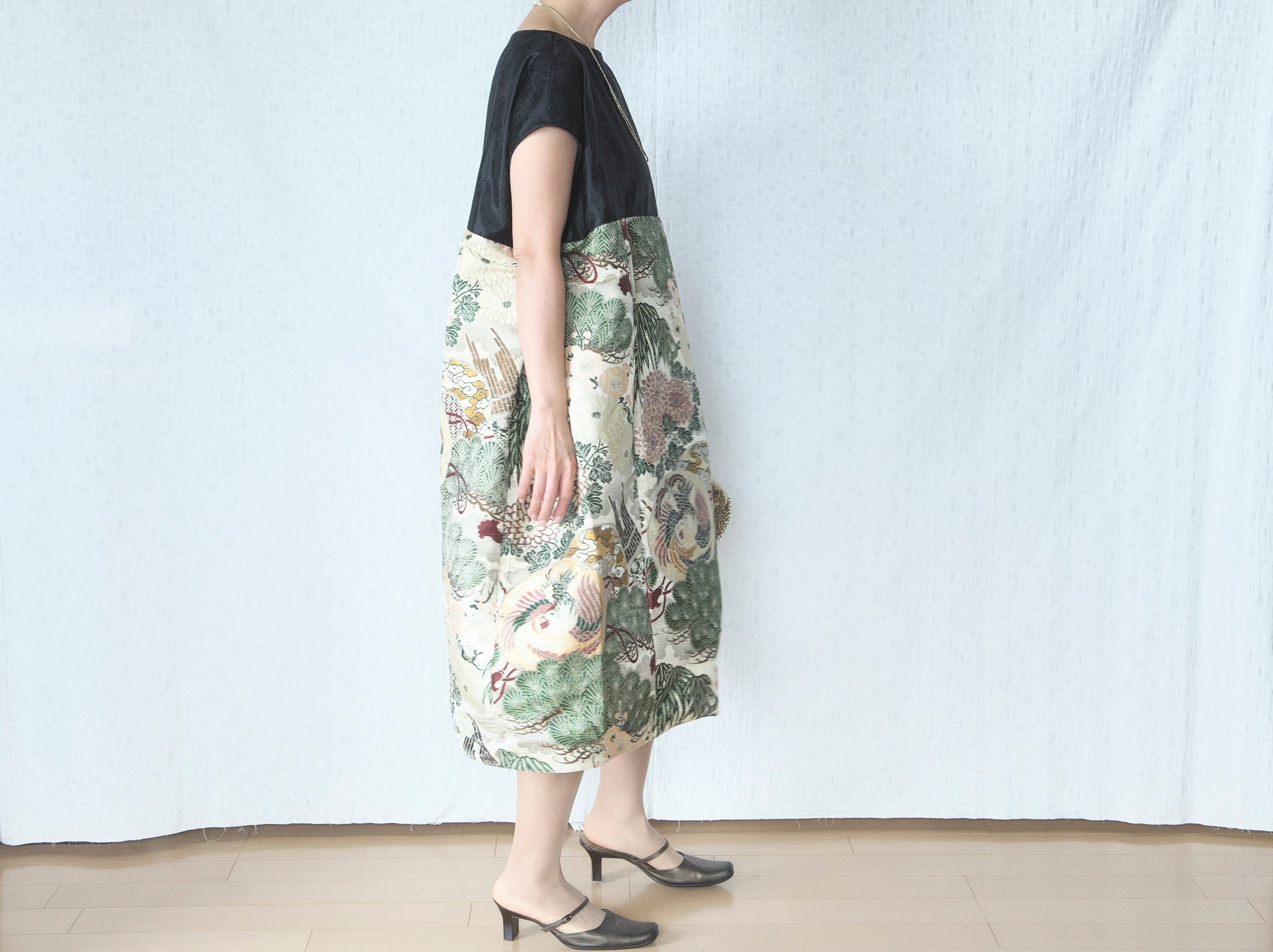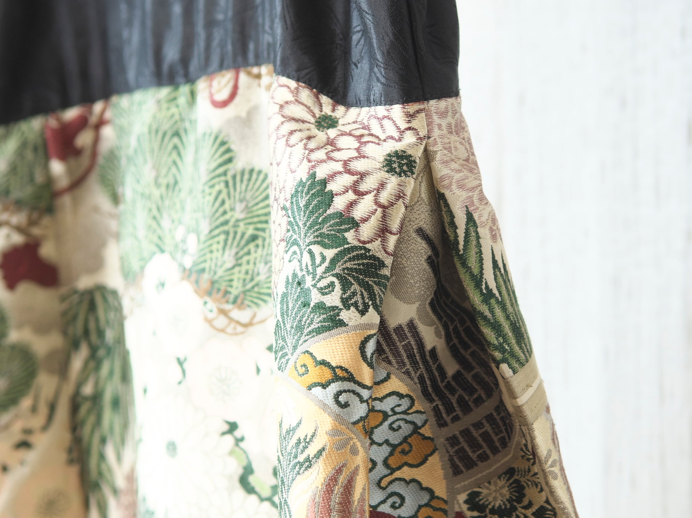 帯をきっちり五等分してスカートに。スカート部分はサイドにタックを畳んでフレアになるよう収めました。他はいっさいハサミを入れていません。総刺繍の厚みのある帯ゆえに結構ボリューム感はあります。コロンと丸いボリューミーなシルエットが可愛いと思っていただける方に届きますように。