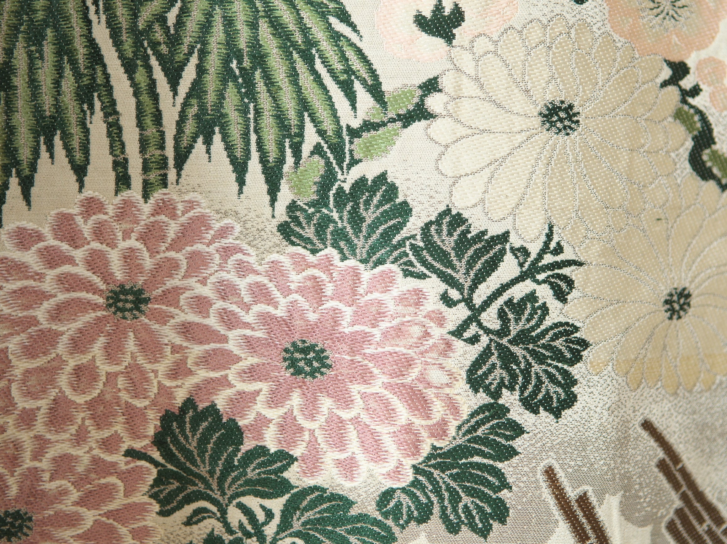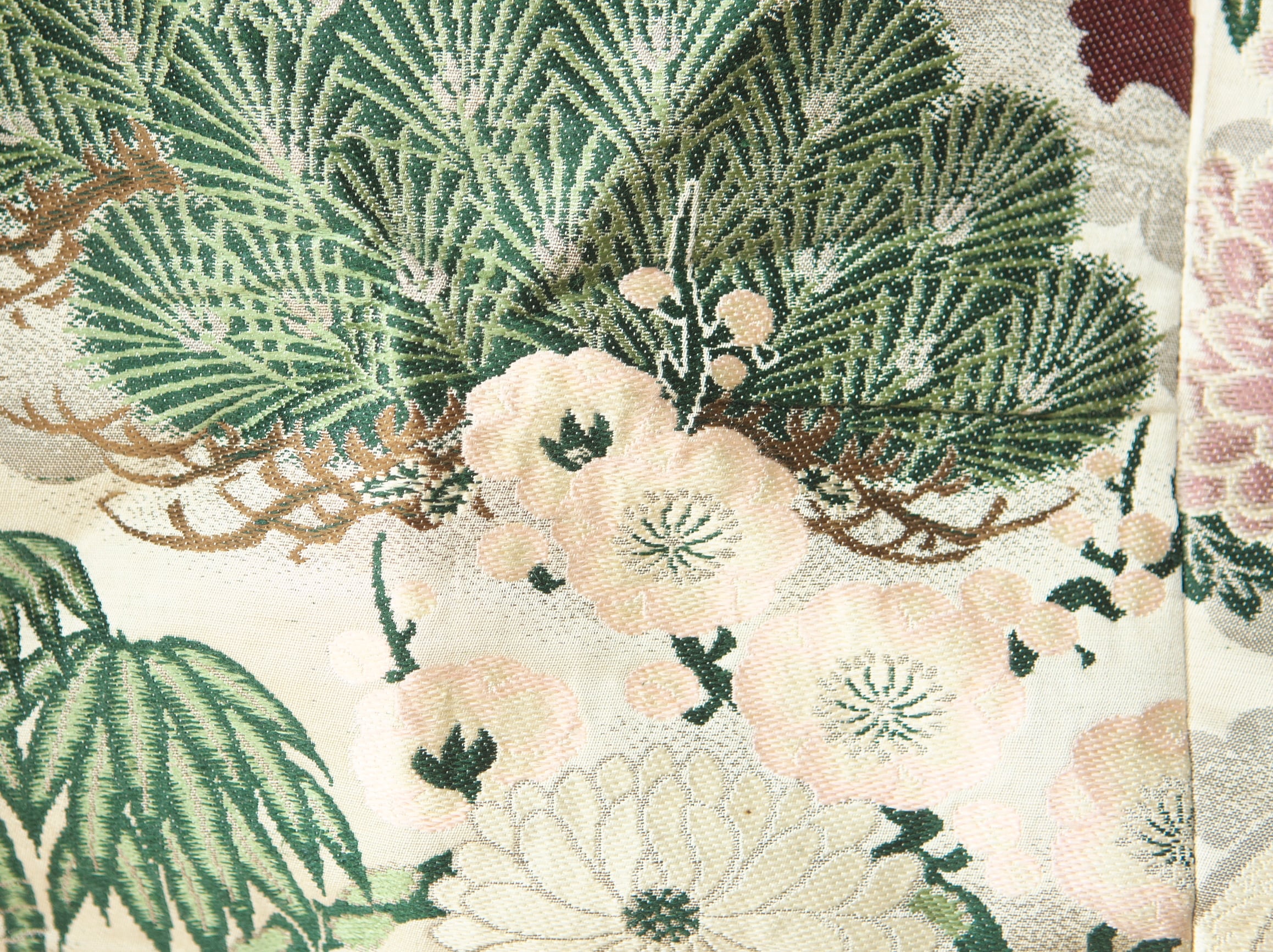 松、竹、菊、鳳凰に雲など縁起の良い模様が散りばめられたアンティーク帯。