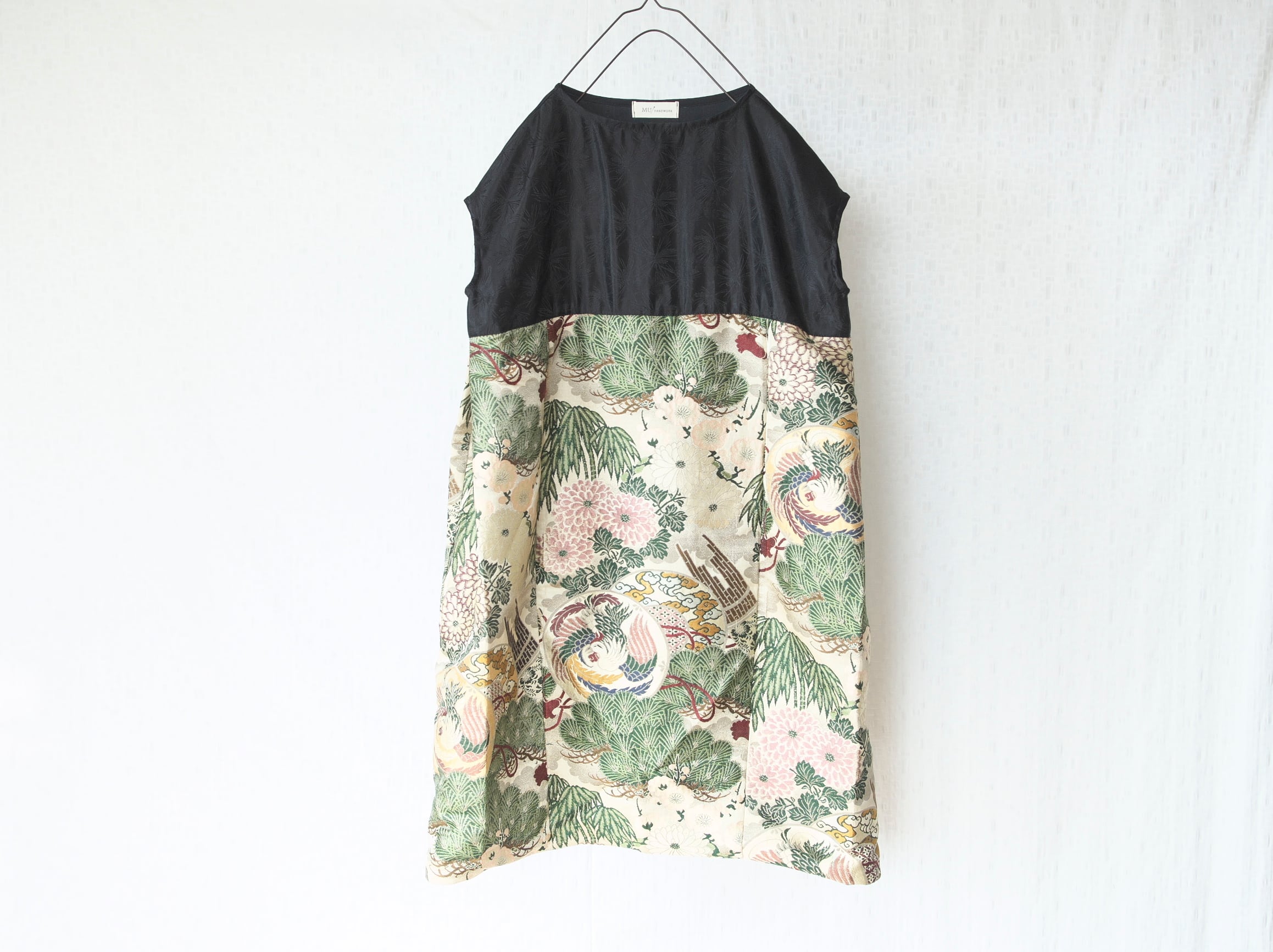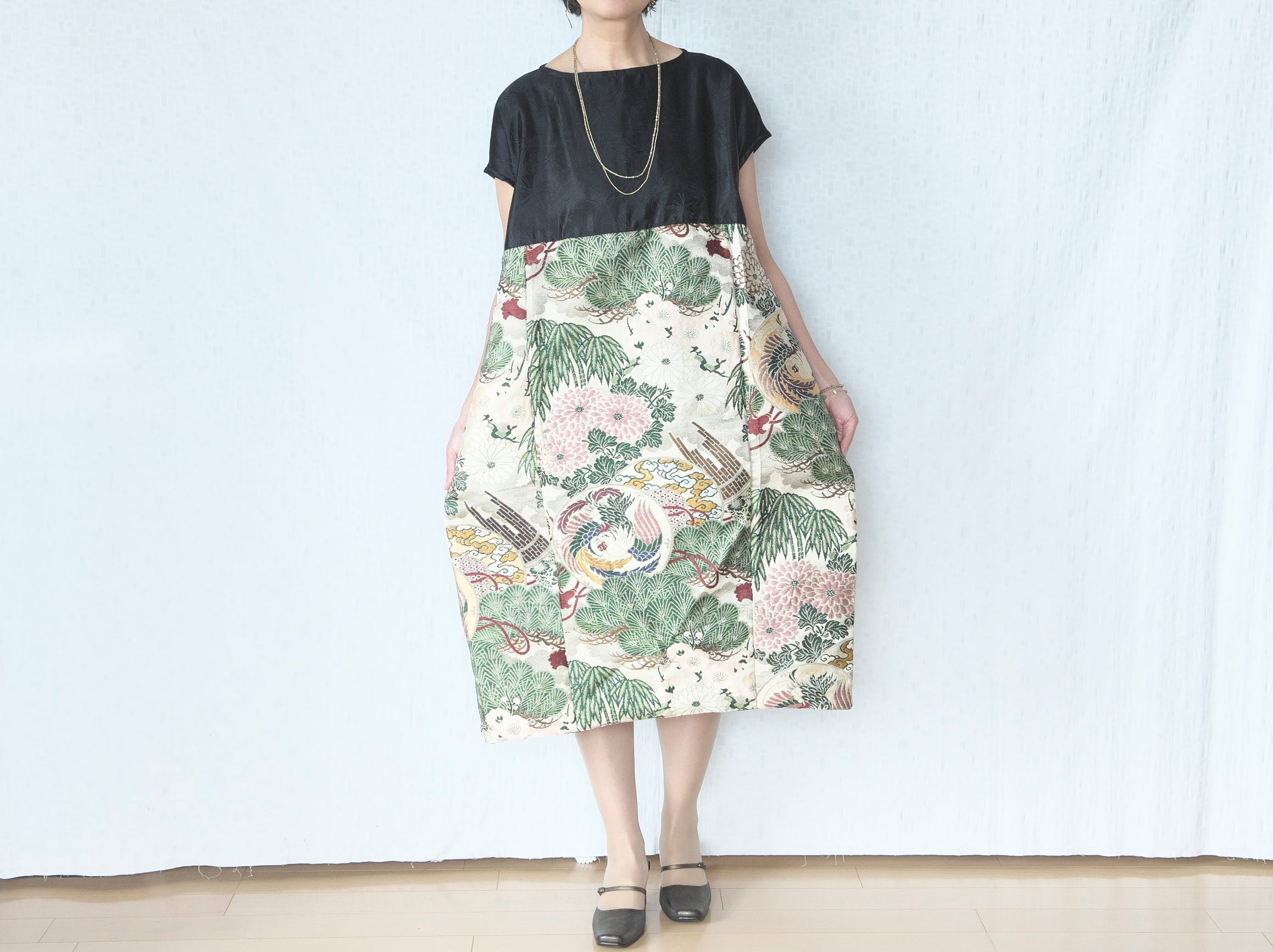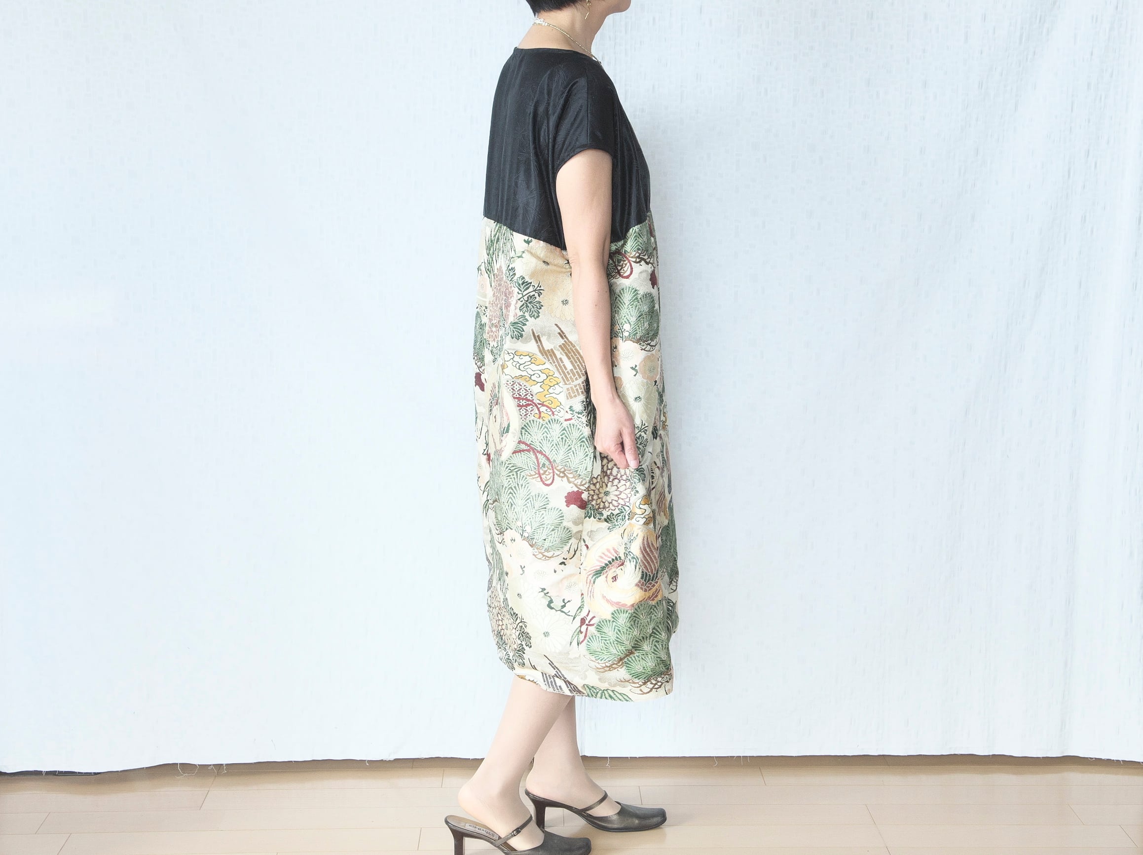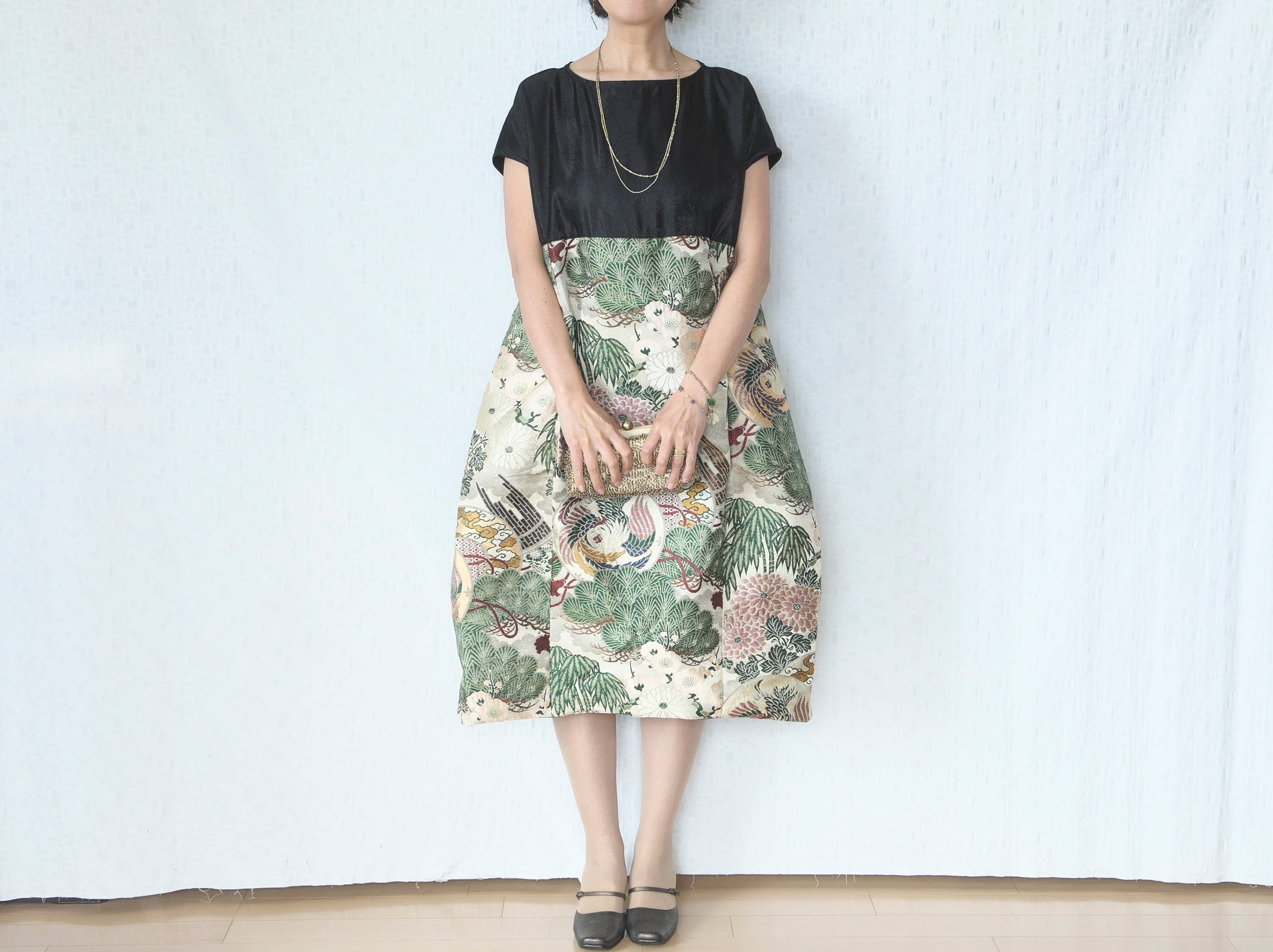 アンティークの名古屋帯と黒帯を組み合わせたツートーンワンピース。