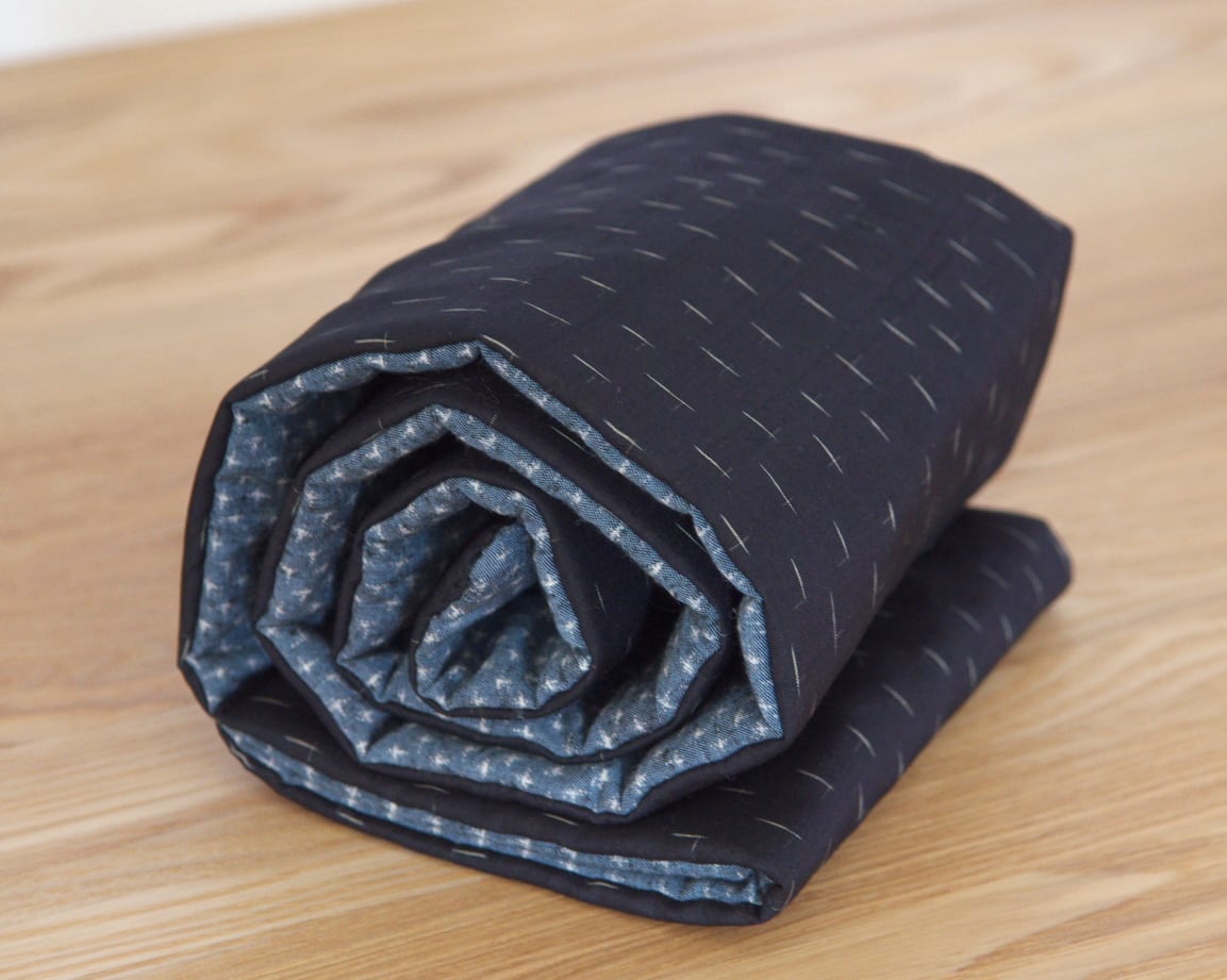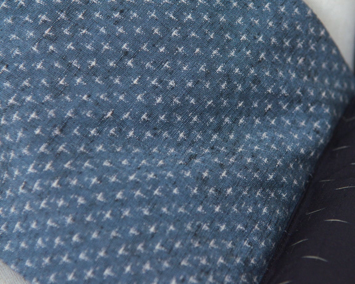 ブルーグレーの十字絣×黒の十字絣(銘仙)のリバーシブル。