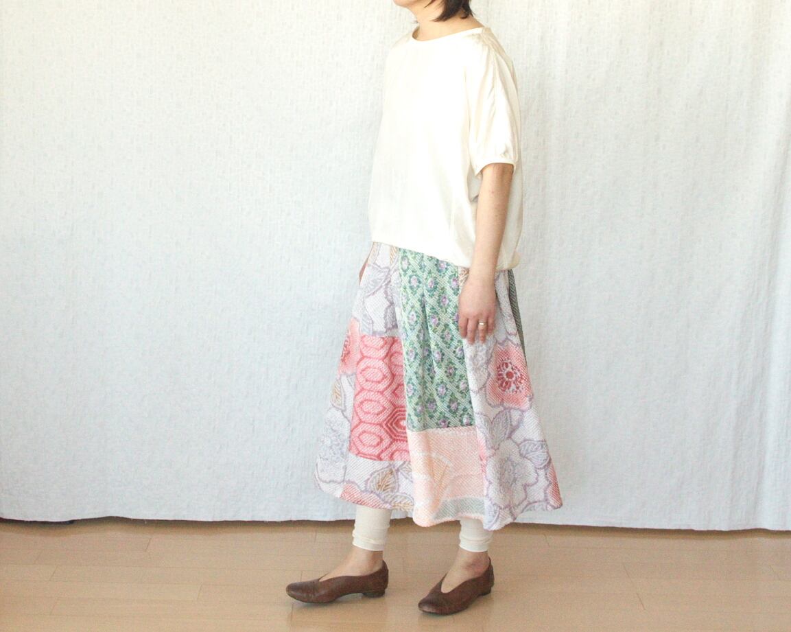 生地をたっぷり使ったボリュームスカートですが、ウエストの切り替え部分にタックとダーツをランダムに入れているので、お腹回りはスッキリ着ていただけます。