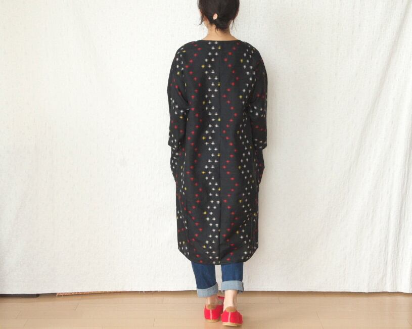 黒地に赤白黄色の小さな十字絣が散りばめられていて、とても可愛いです。